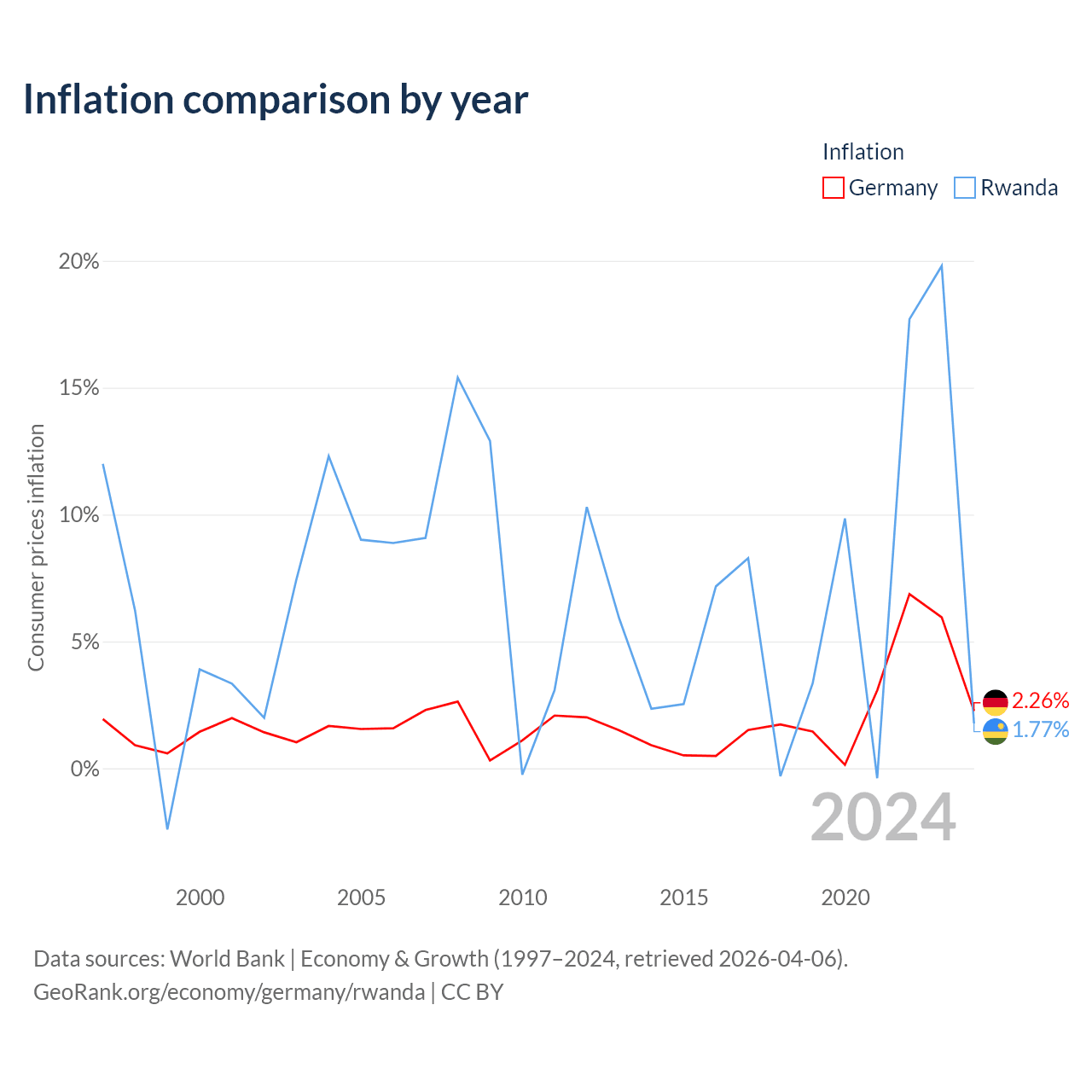 Germany has a GDP of $4.69T compared to $14.3B for Rwanda, ranking 3/197 and 144/197 by economy size, respectively.