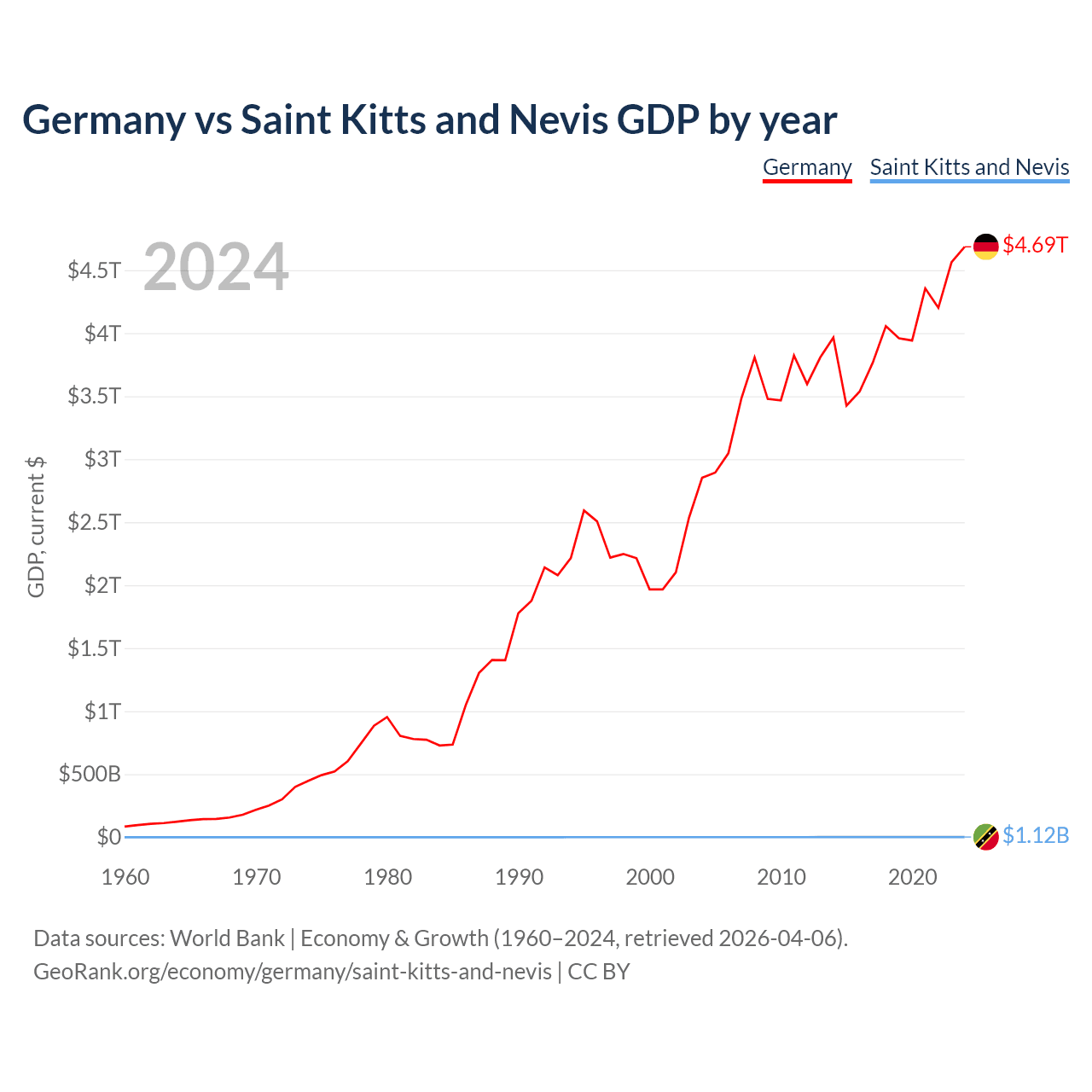 Germany has a GDP of $4.69T compared to $1.12B for Saint Kitts and Nevis, ranking 3/197 and 187/197 by economy size, respectively.