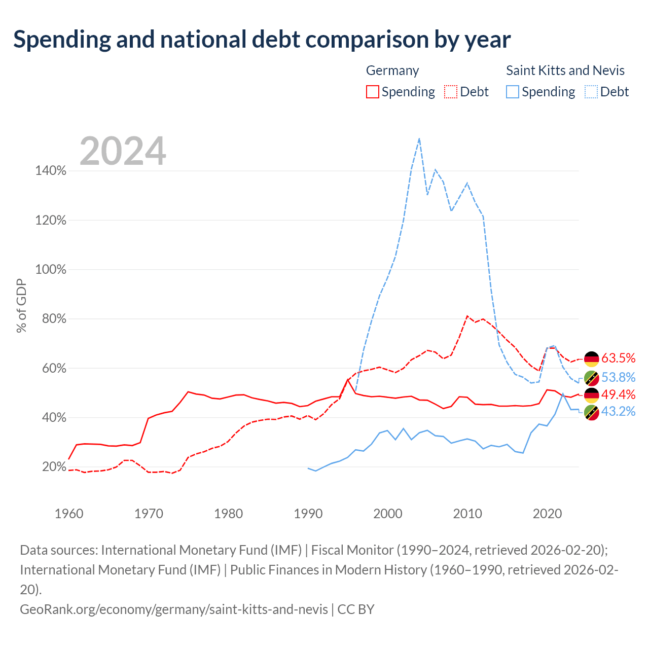 Germany has $2.97T in government debt (63.5% of GDP), compared to $604M (53.8% of GDP) in Saint Kitts and Nevis.