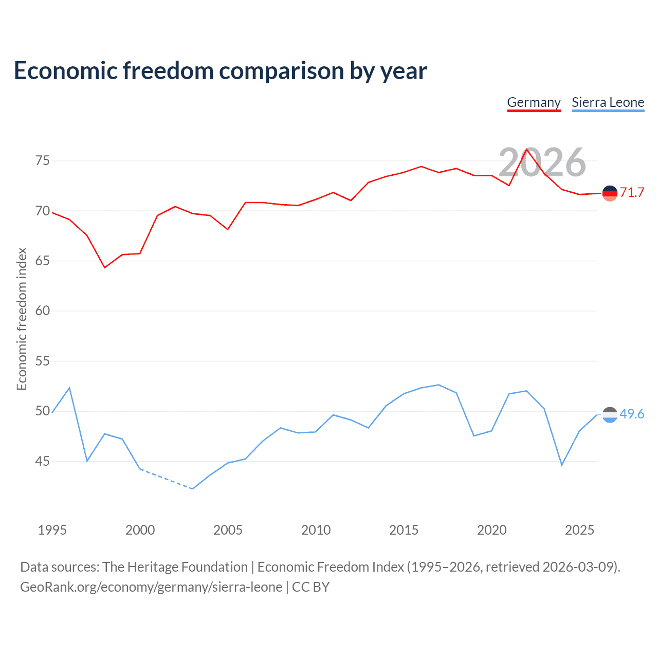 The Economic Freedom Index for Germany is 71.7, ranking 30/197, compared to 49.6 for Sierra Leone, ranking 165/197. The chart above displays a comparison of annual changes in economic freedom indexes.
