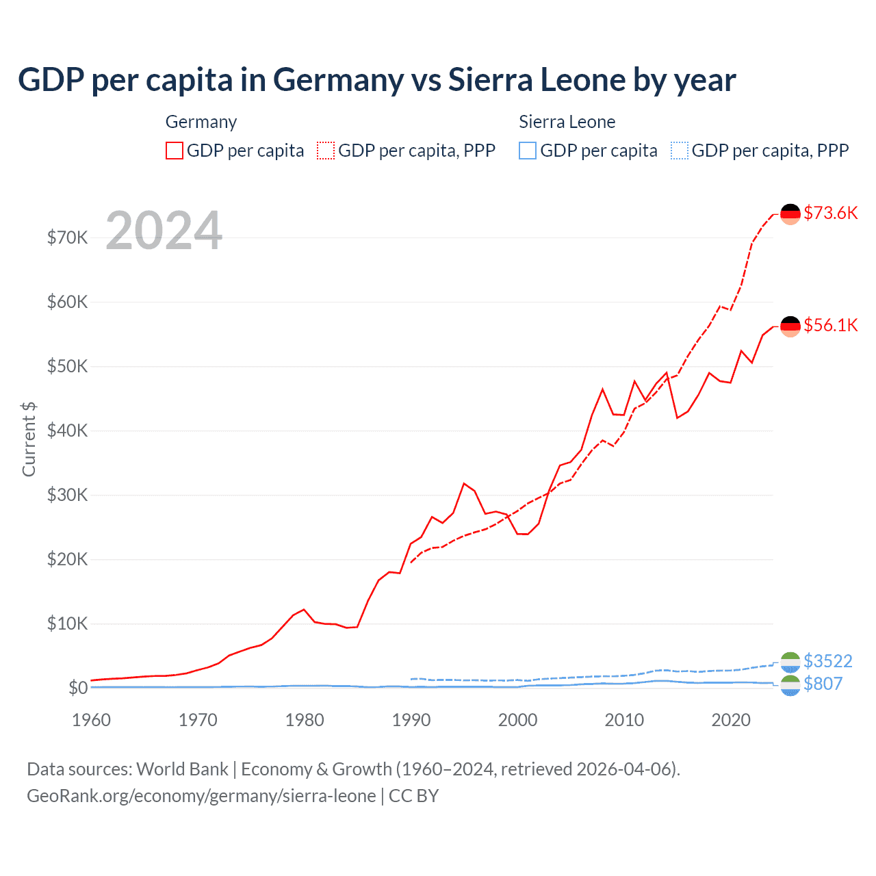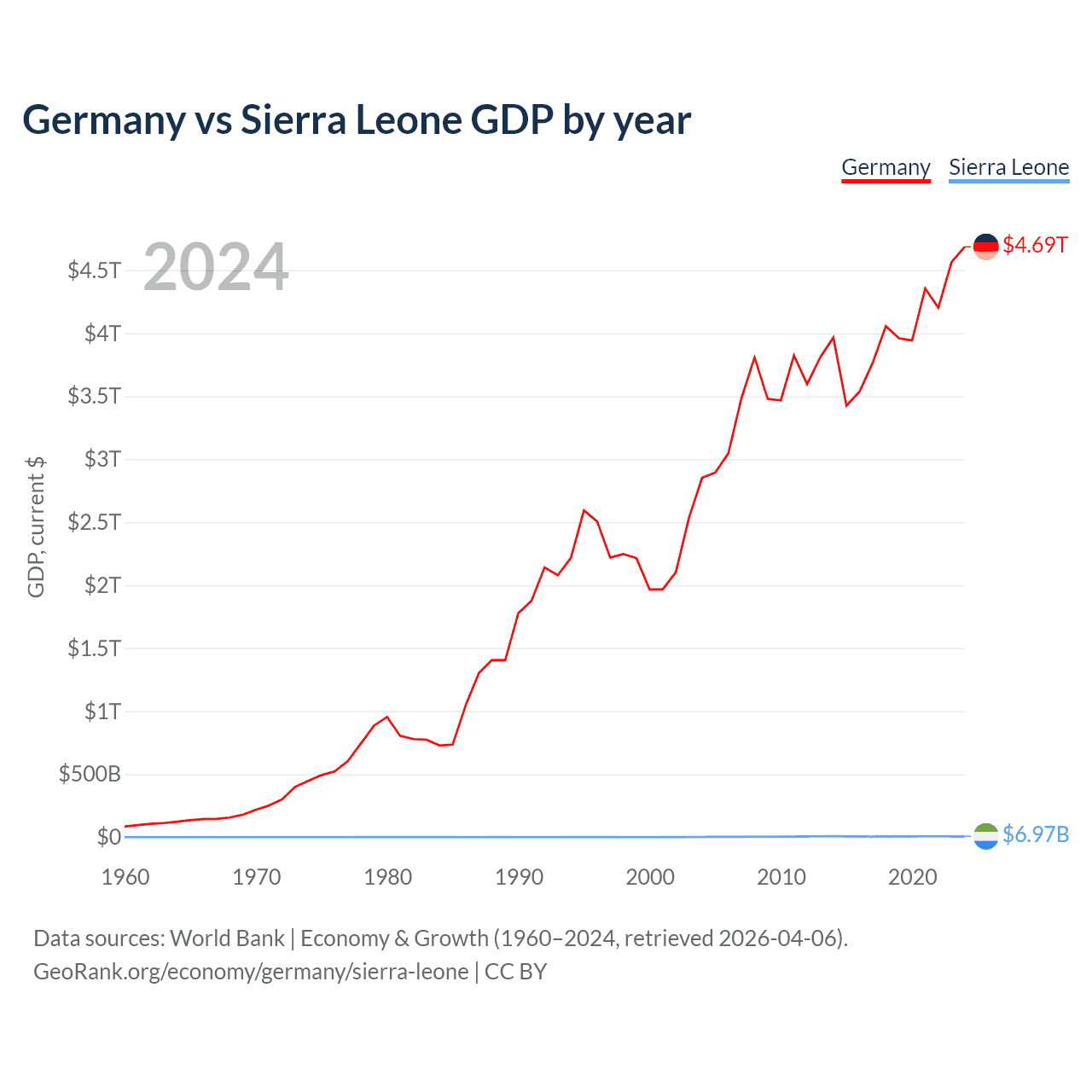 Germany has a GDP of $4.69T compared to $6.97B for Sierra Leone, ranking 3/197 and 160/197 by economy size, respectively.