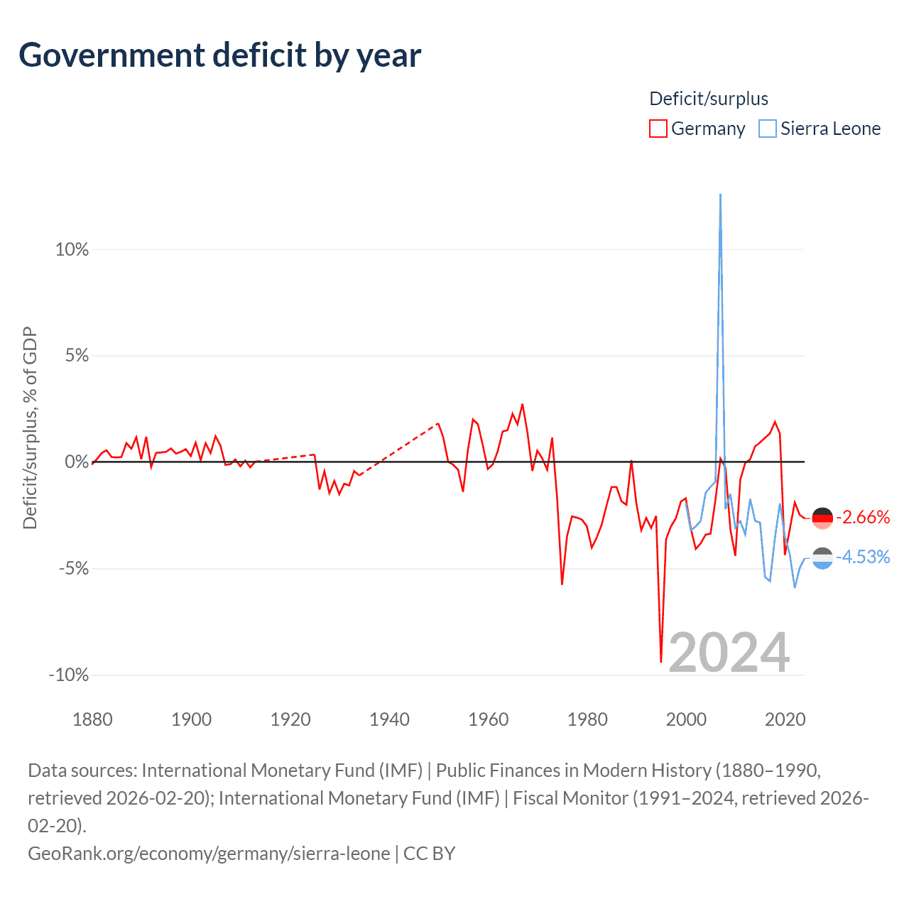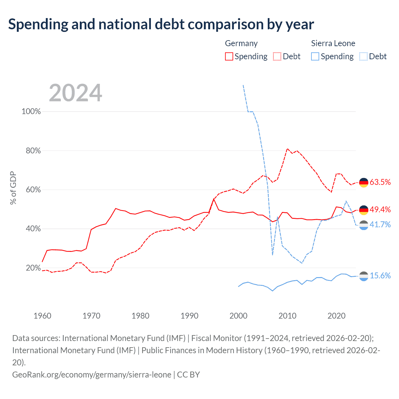 Germany has $2.97T in government debt (63.5% of GDP), compared to $2.91B (41.7% of GDP) in Sierra Leone.