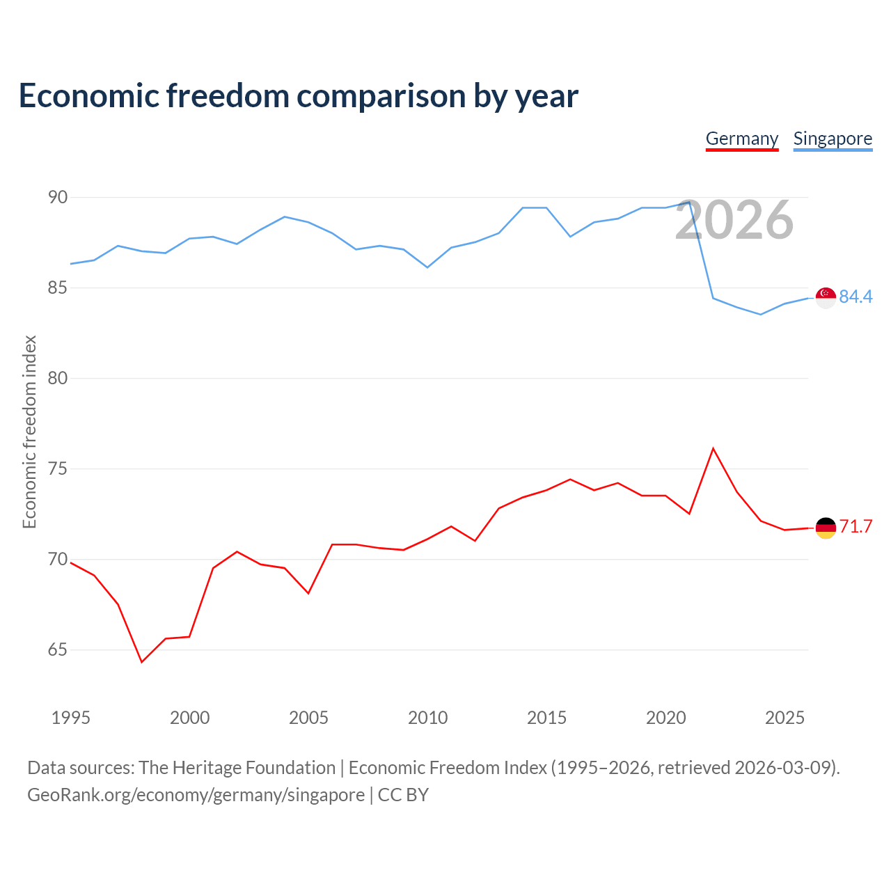 The Economic Freedom Index for Germany is 71.7, ranking 30/197, compared to 84.4 for Singapore, ranking 1/197. The chart above displays a comparison of annual changes in economic freedom indexes.