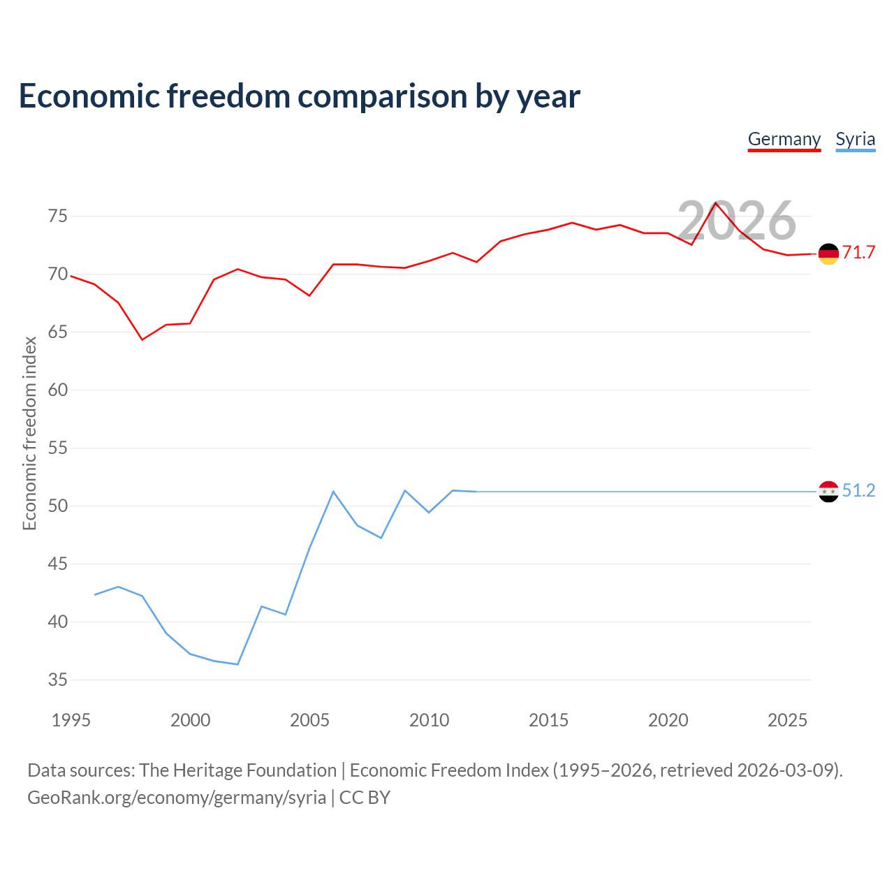 The Economic Freedom Index for Germany is 71.7, ranking 30/197, compared to 51.2 for Syria, ranking 155/197. The chart above displays a comparison of annual changes in economic freedom indexes.