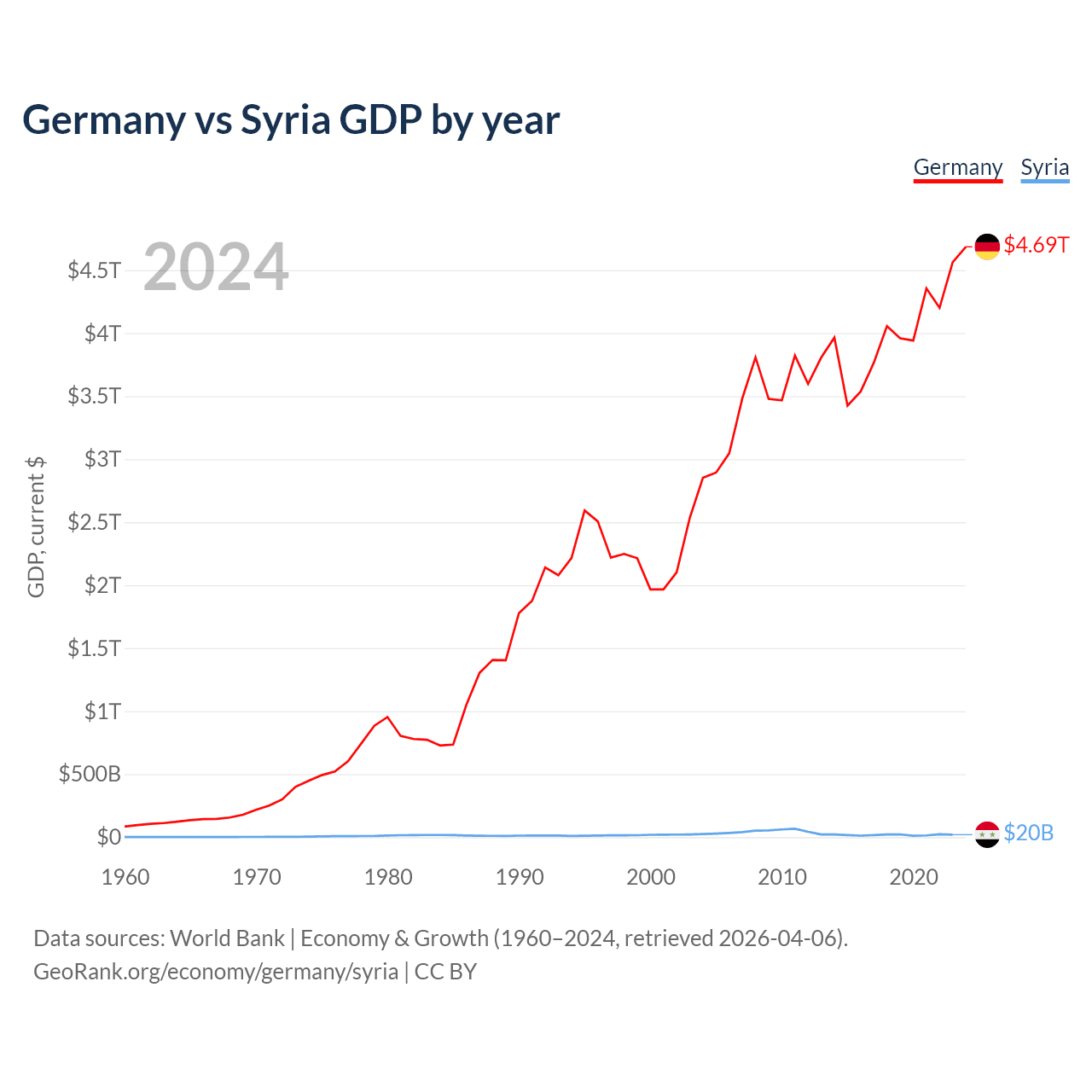 Germany has a GDP of $4.69T compared to $20B for Syria, ranking 3/197 and 129/197 by economy size, respectively.
