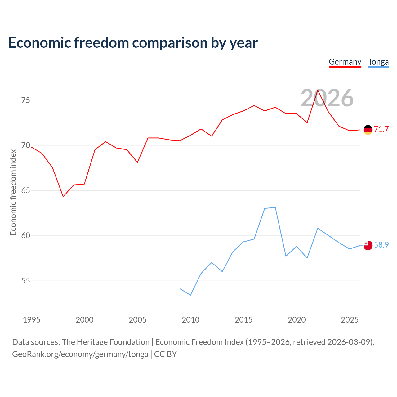 The Economic Freedom Index for Germany is 71.7, ranking 30/197, compared to 58.9 for Tonga, ranking 107/197. The chart above displays a comparison of annual changes in economic freedom indexes.
