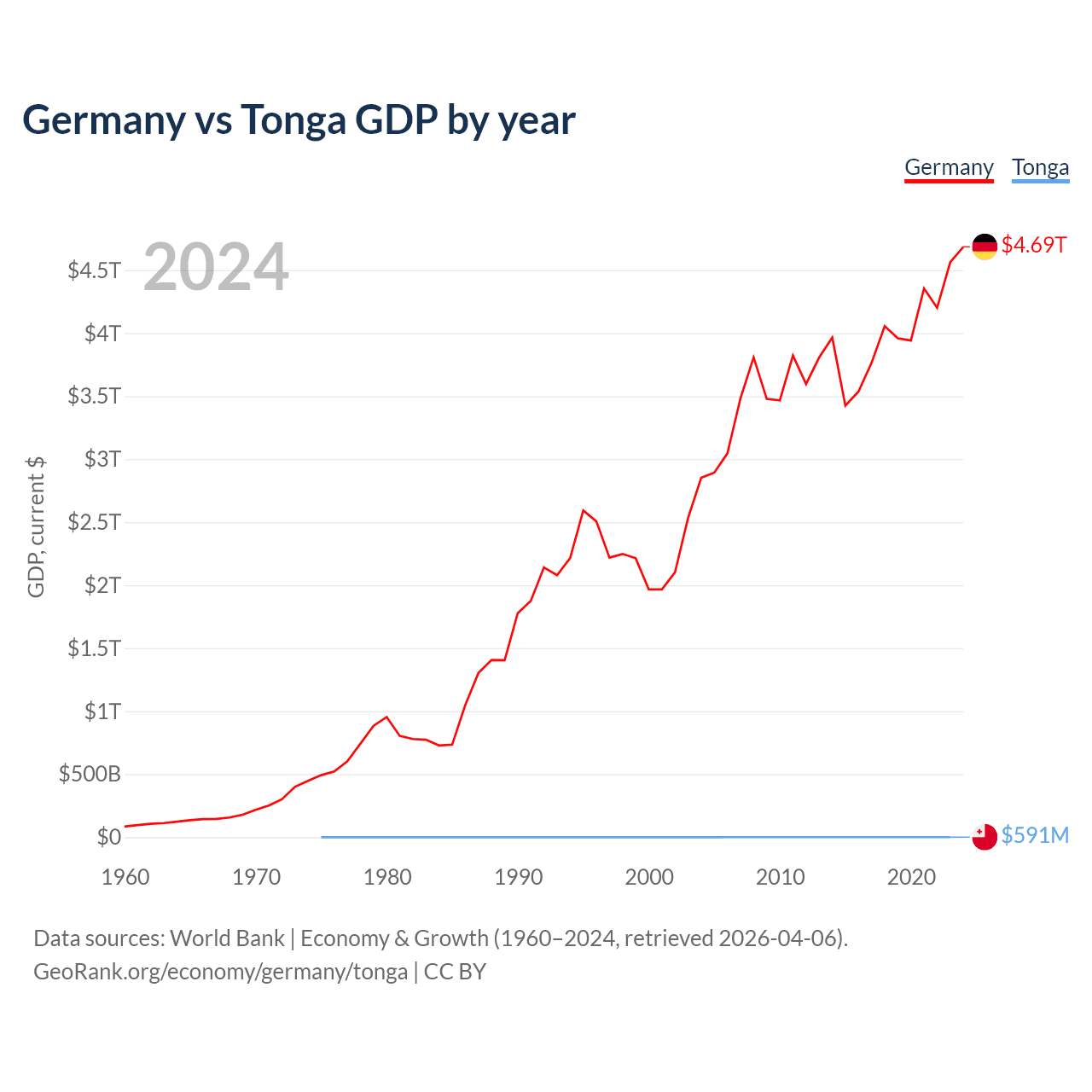 Germany has a GDP of $4.69T compared to $591M for Tonga, ranking 3/197 and 191/197 by economy size, respectively.
