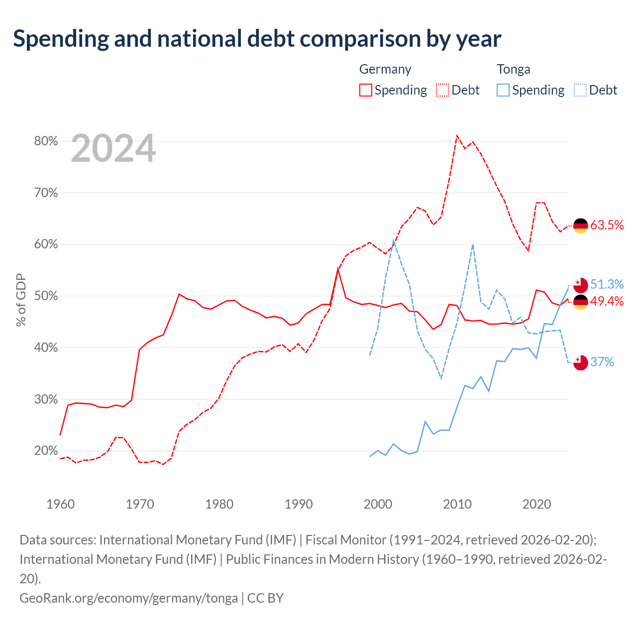 Germany has $2.97T in government debt (63.5% of GDP), compared to $256M (37% of GDP) in Tonga.