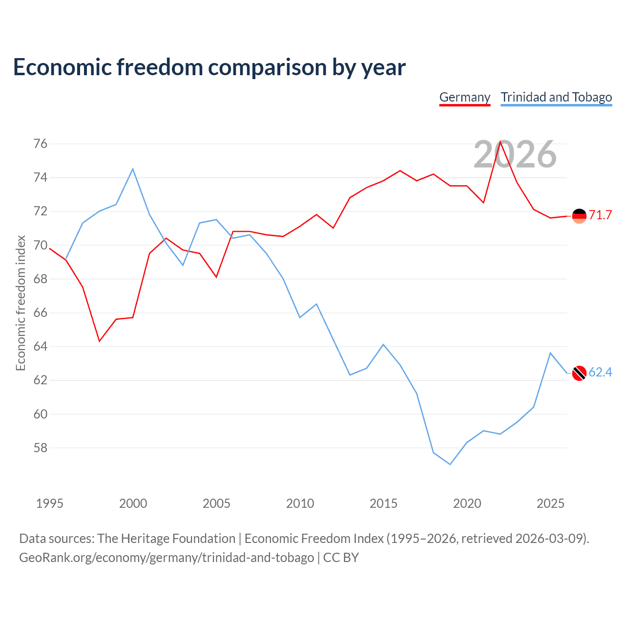 The Economic Freedom Index for Germany is 71.7, ranking 30/197, compared to 62.4 for Trinidad and Tobago, ranking 87/197. The chart above displays a comparison of annual changes in economic freedom indexes.