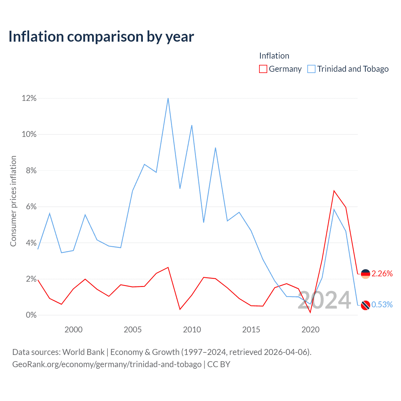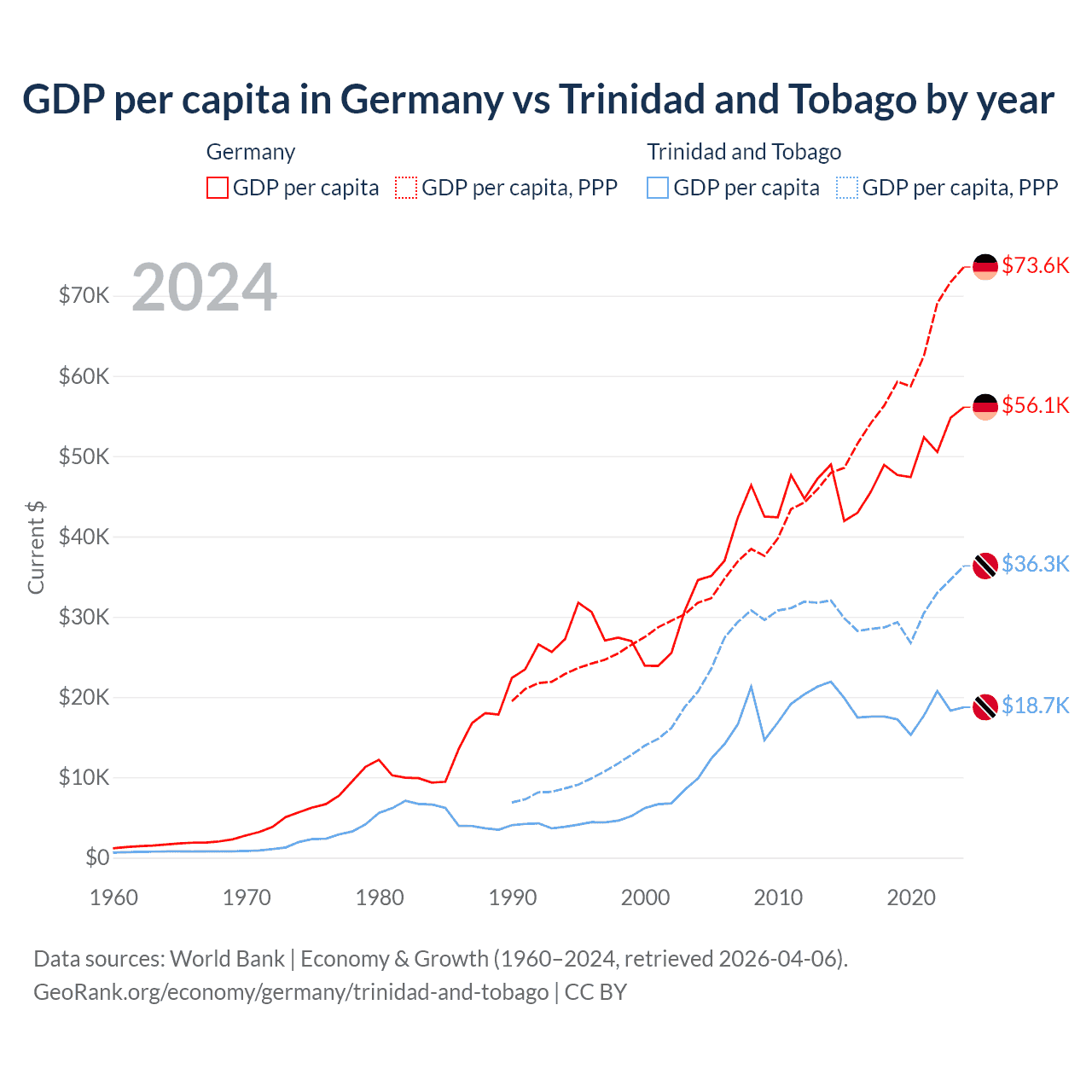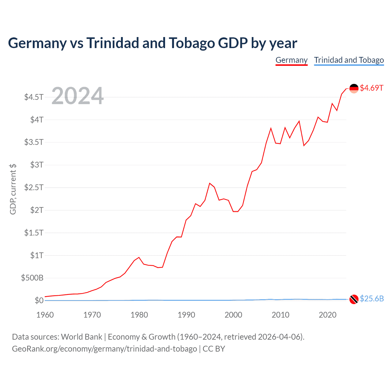Germany has a GDP of $4.69T compared to $25.6B for Trinidad and Tobago, ranking 3/197 and 115/197 by economy size, respectively.