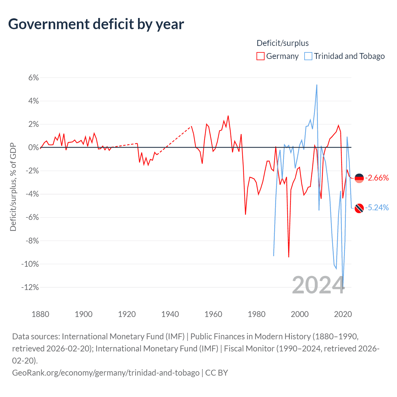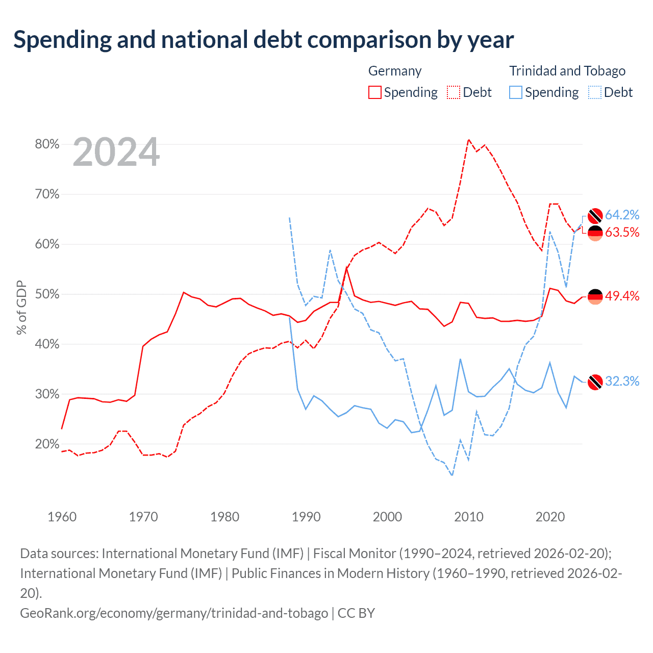 Germany has $2.97T in government debt (63.5% of GDP), compared to $16.5B (64.2% of GDP) in Trinidad and Tobago.