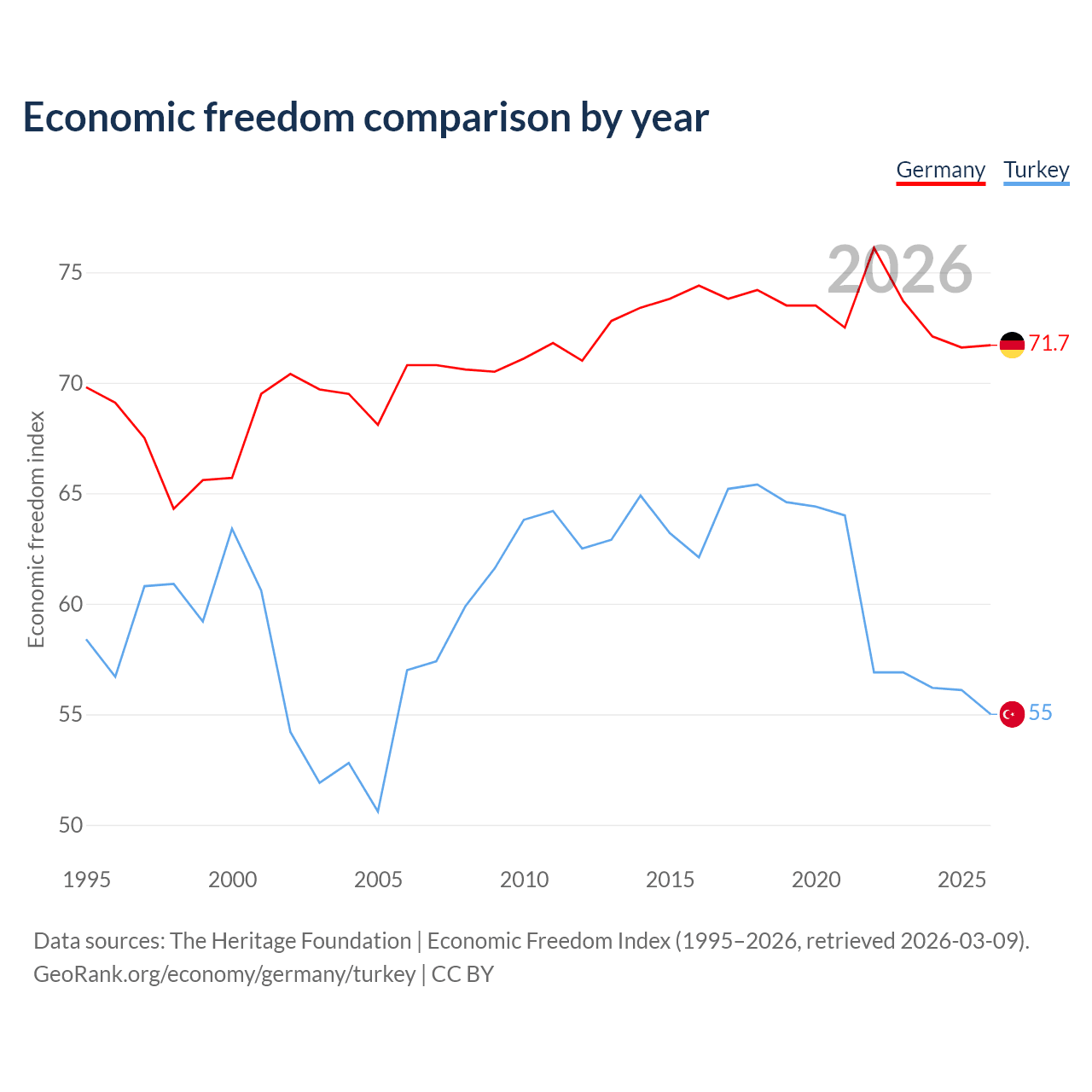 The Economic Freedom Index for Germany is 71.7, ranking 30/197, compared to 55 for Turkey, ranking 129/197. The chart above displays a comparison of annual changes in economic freedom indexes.