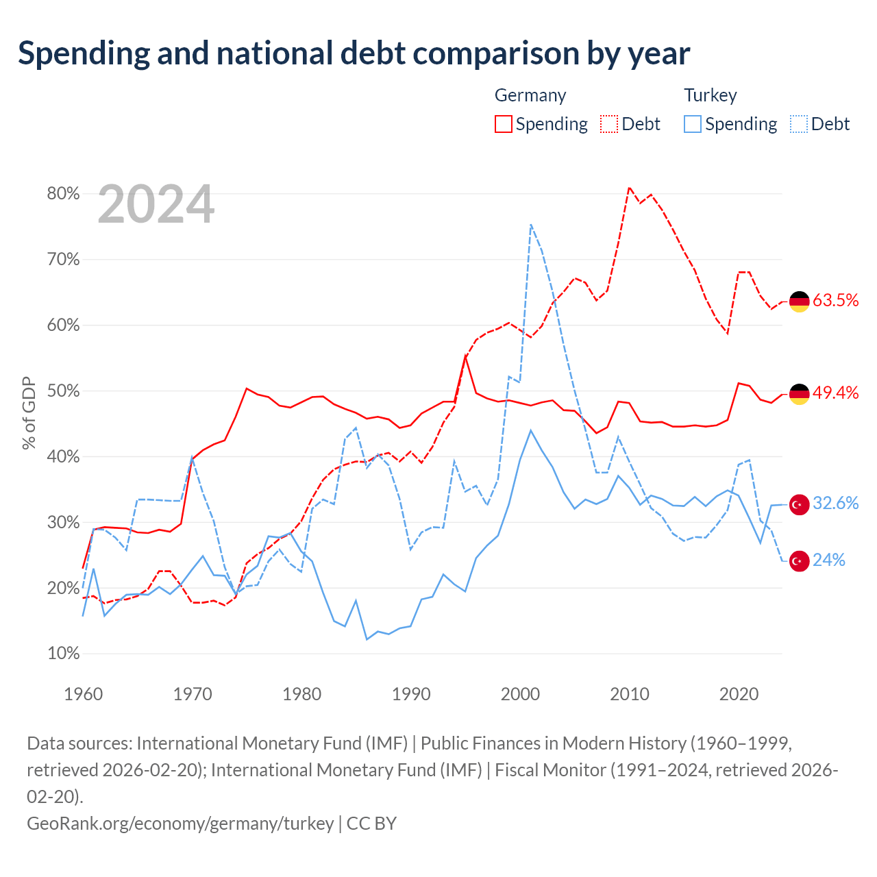 Germany has $2.97T in government debt (63.5% of GDP), compared to $327B (24% of GDP) in Turkey.