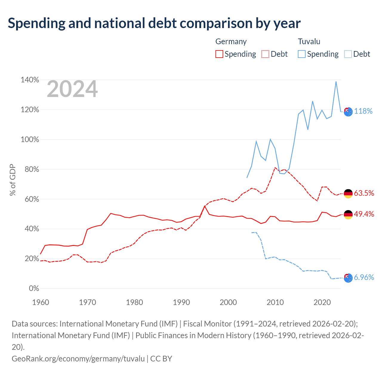 Germany has $2.97T in government debt (63.5% of GDP), compared to $4.15M (6.96% of GDP) in Tuvalu.