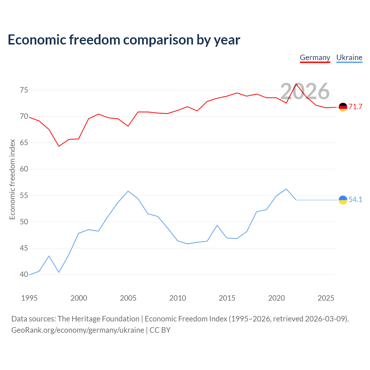 The Economic Freedom Index for Germany is 71.7, ranking 30/197, compared to 54.1 for Ukraine, ranking 135/197. The chart above displays a comparison of annual changes in economic freedom indexes.