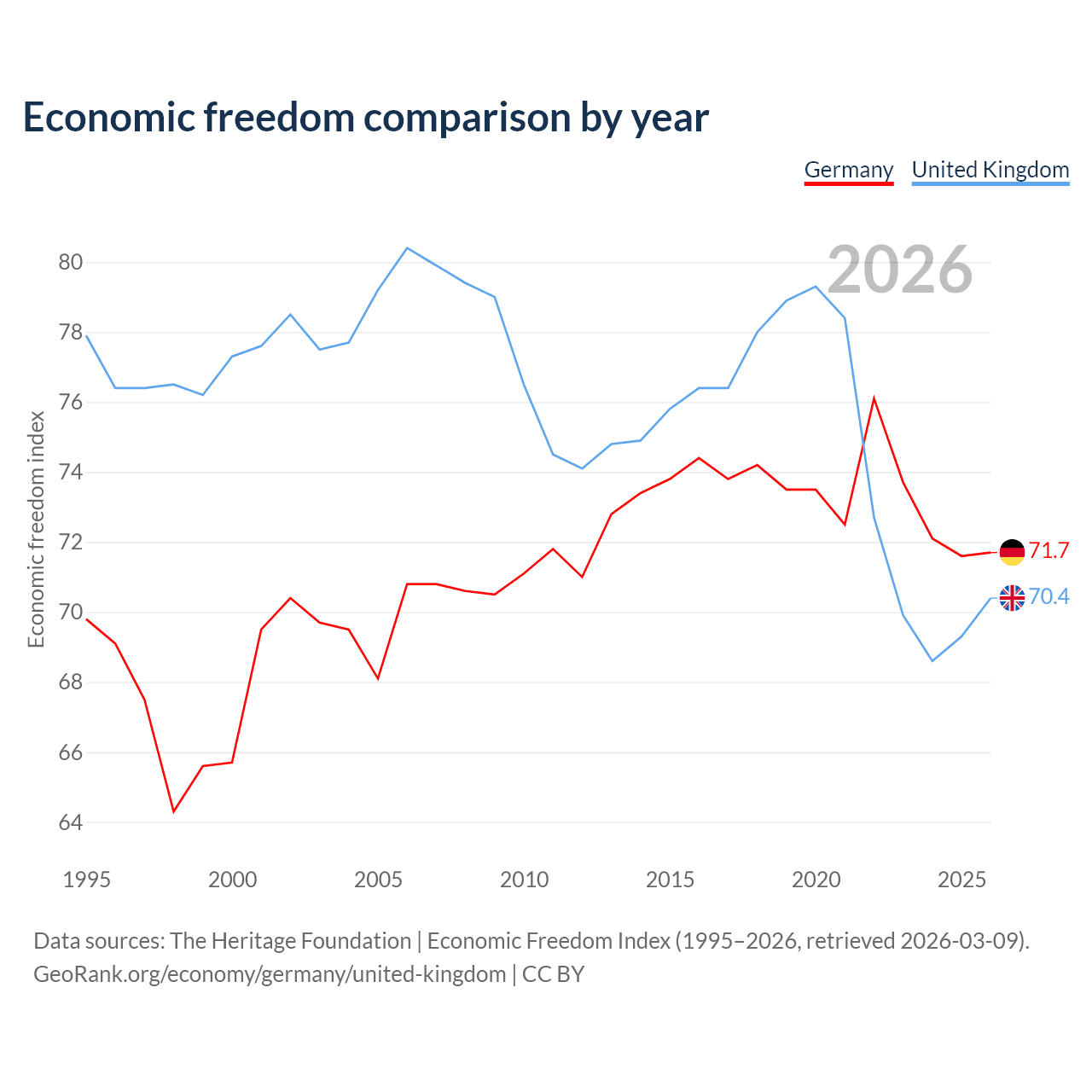 The Economic Freedom Index for Germany is 71.7, ranking 30/197, compared to 70.4 for the United Kingdom, ranking 35/197. The chart above displays a comparison of annual changes in economic freedom indexes.