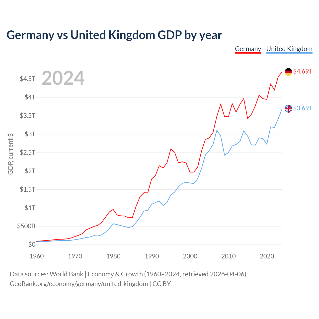 Germany has a GDP of $4.69T compared to $3.69T for the United Kingdom, ranking 3/197 and 6/197 by economy size, respectively.