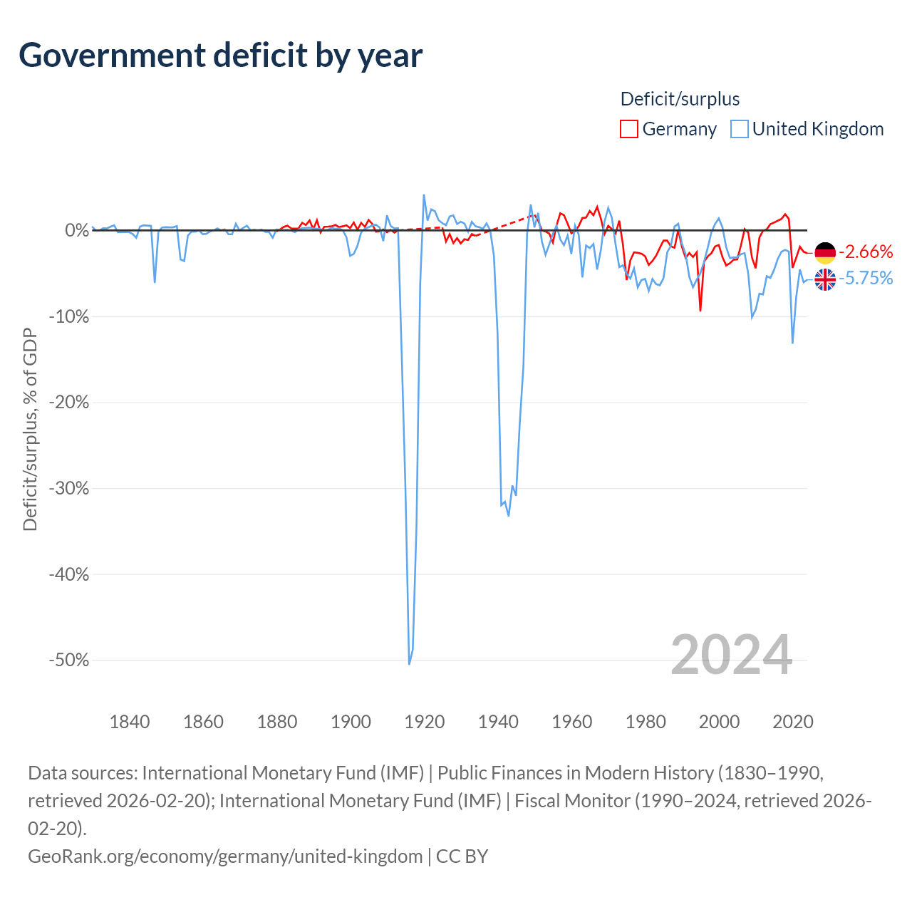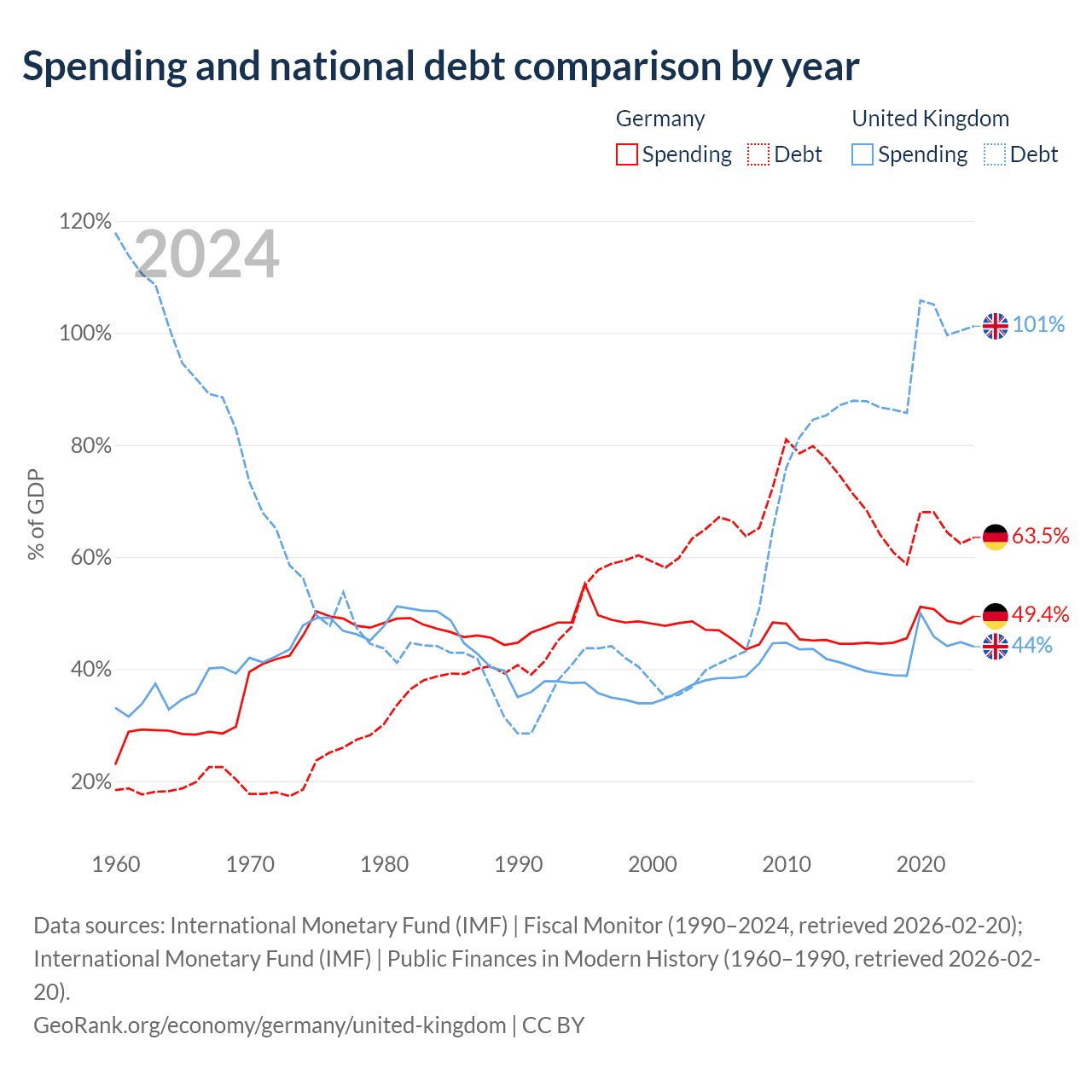 Germany has $2.97T in government debt (63.5% of GDP), compared to $3.73T (101.2% of GDP) in the United Kingdom.