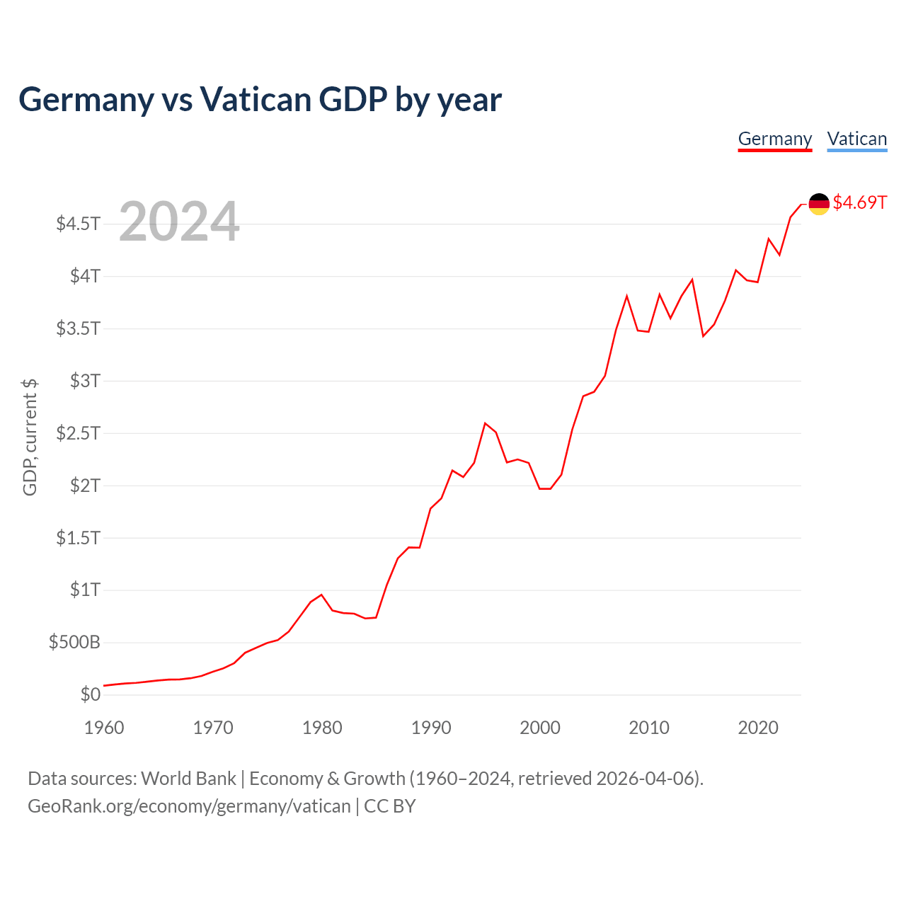 Germany has a GDP of $4.69T compared to $19.8M for the Vatican, ranking 3/197 and 197/197 by economy size, respectively.