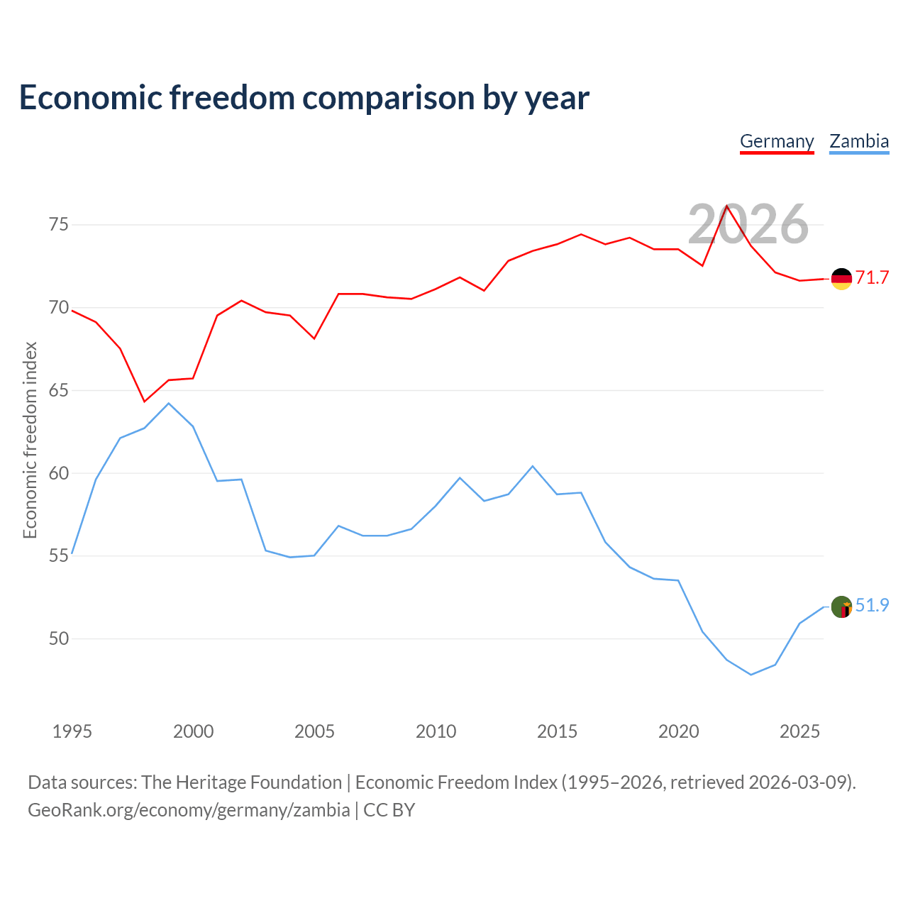 The Economic Freedom Index for Germany is 71.7, ranking 30/197, compared to 51.9 for Zambia, ranking 152/197. The chart above displays a comparison of annual changes in economic freedom indexes.