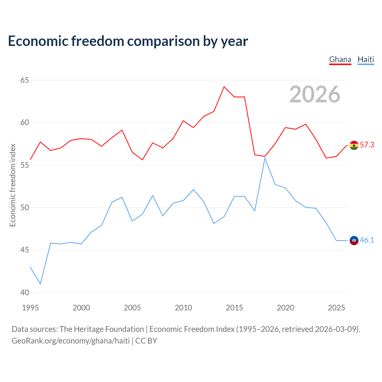 The Economic Freedom Index for Ghana is 57.3, ranking 118/197, compared to 46.1 for Haiti, ranking 178/197. The chart above displays a comparison of annual changes in economic freedom indexes.