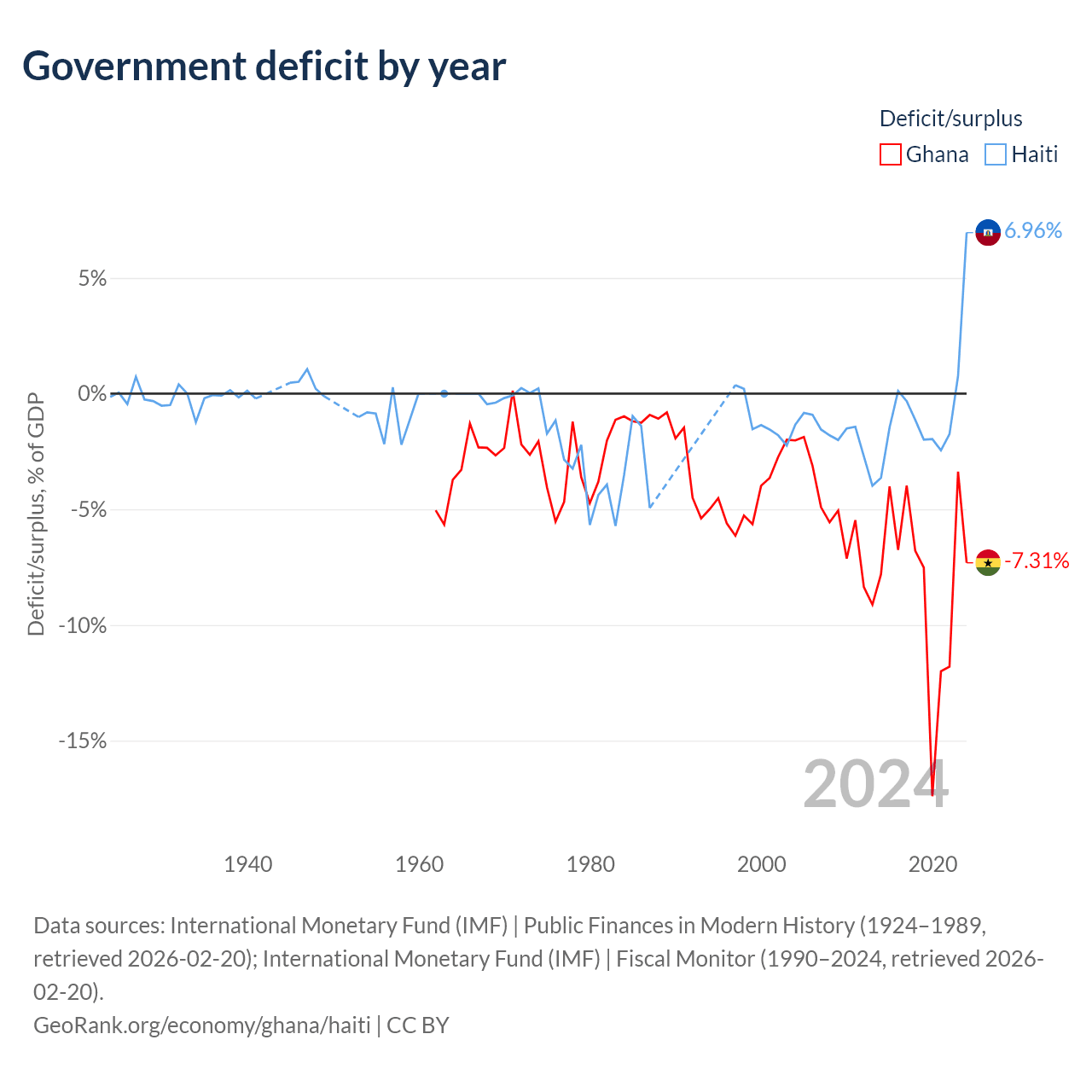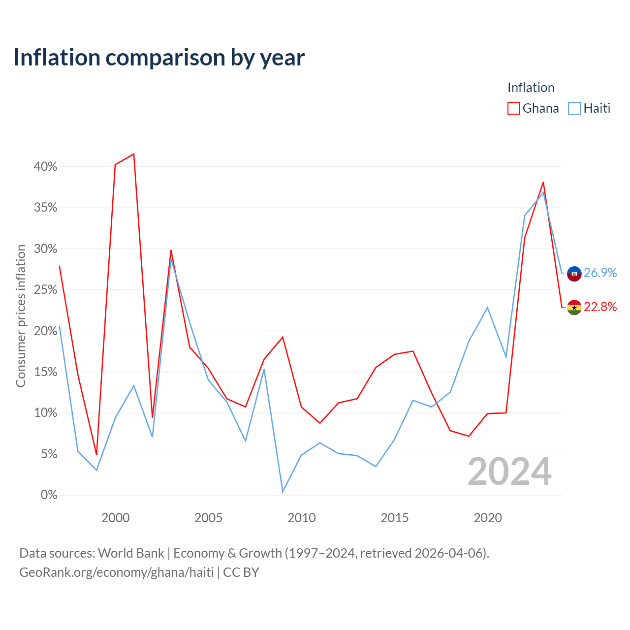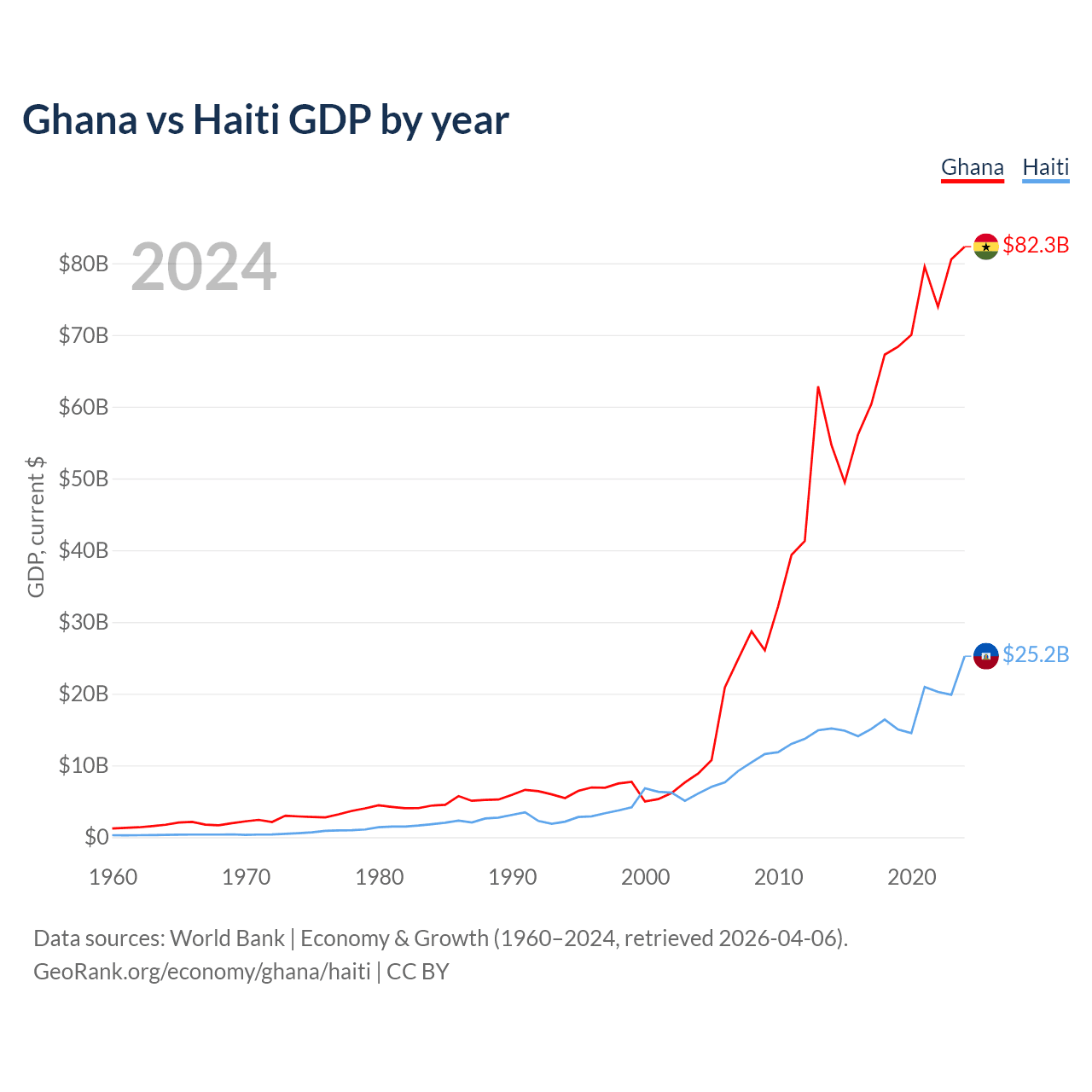 Ghana has a GDP of $82.3B compared to $25.2B for Haiti, ranking 80/197 and 117/197 by economy size, respectively.