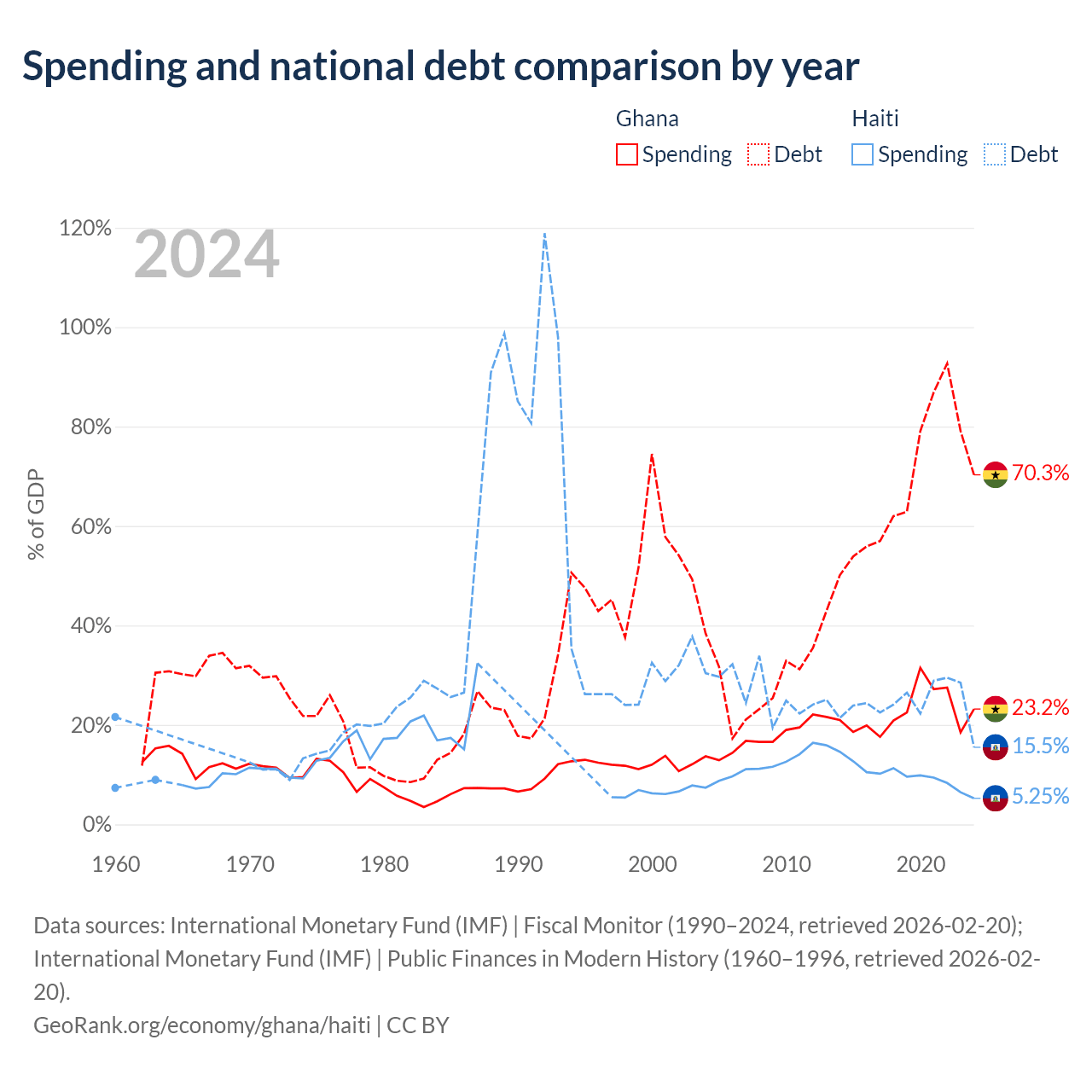 Ghana has $57.9B in government debt (70.3% of GDP), compared to $3.91B (15.5% of GDP) in Haiti.
