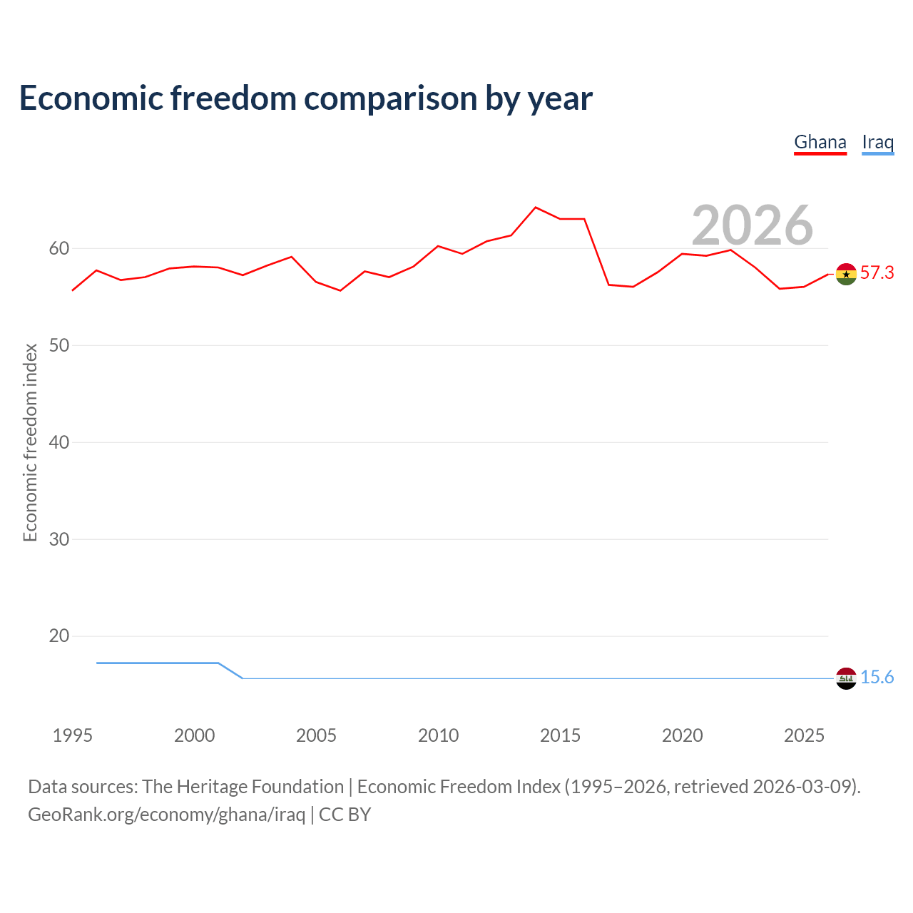 The Economic Freedom Index for Ghana is 57.3, ranking 118/197, compared to 15.6 for Iraq, ranking 196/197. The chart above displays a comparison of annual changes in economic freedom indexes.