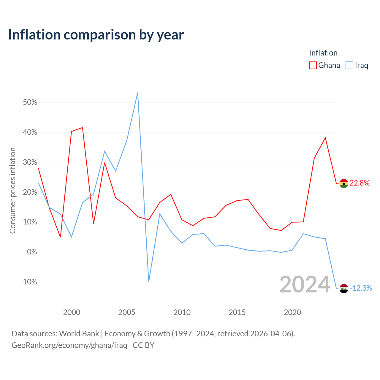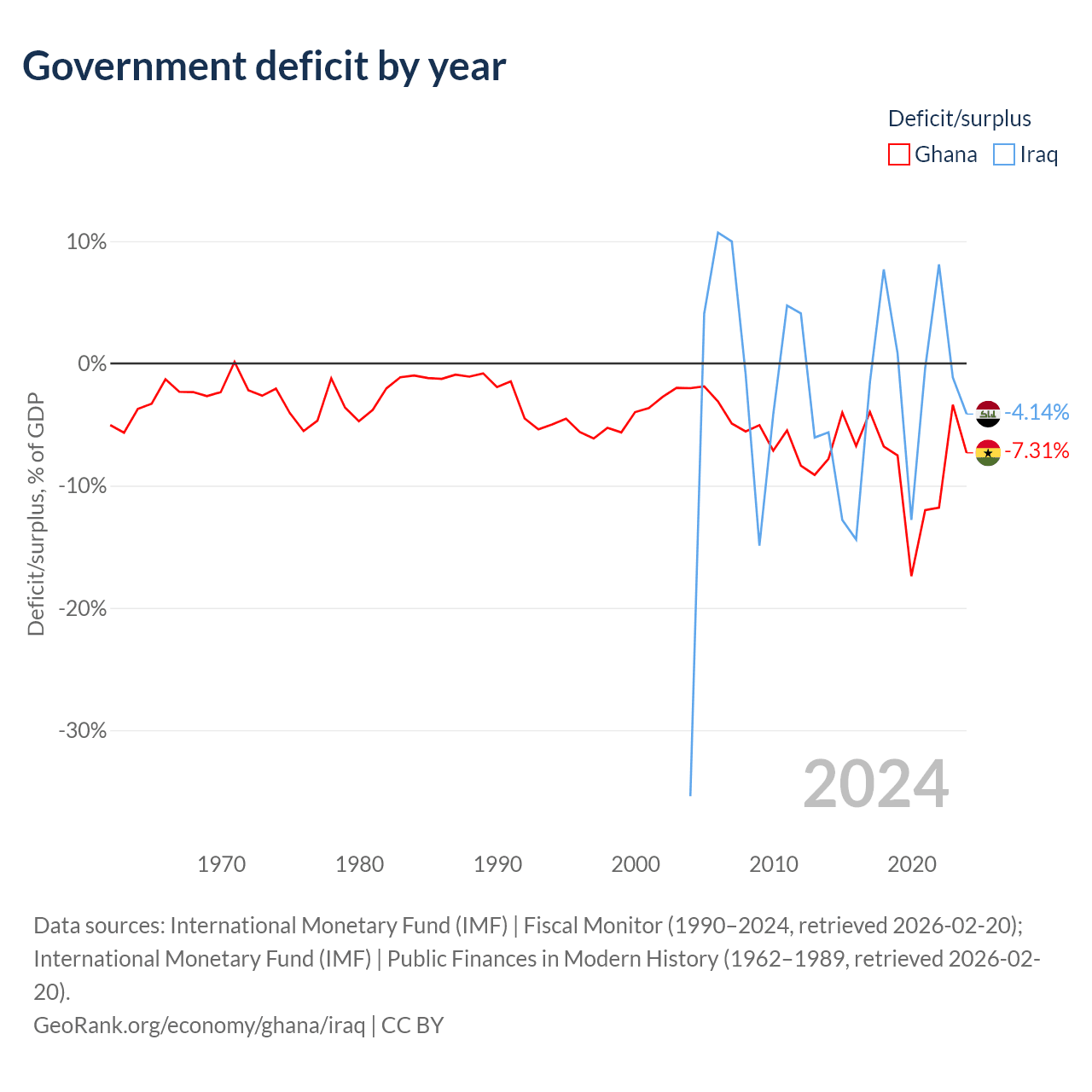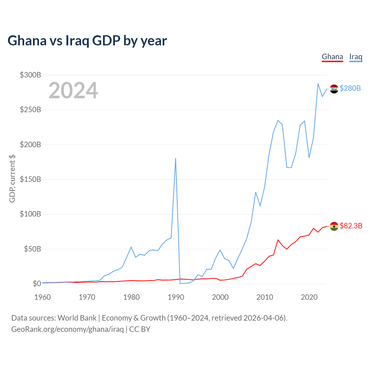 Ghana has a GDP of $82.3B compared to $280B for Iraq, ranking 80/197 and 50/197 by economy size, respectively.