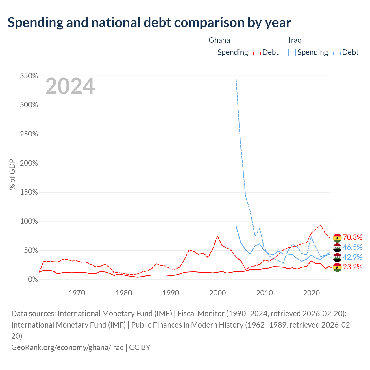 Ghana has $57.9B in government debt (70.3% of GDP), compared to $130B (46.5% of GDP) in Iraq.