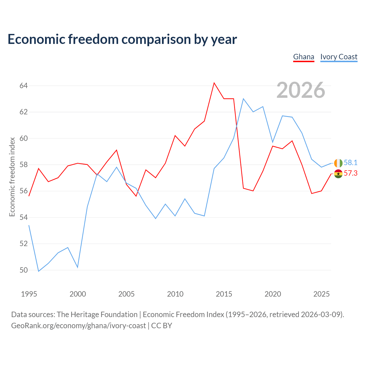 The Economic Freedom Index for Ghana is 57.3, ranking 118/197, compared to 58.1 for Ivory Coast, ranking 111/197. The chart above displays a comparison of annual changes in economic freedom indexes.