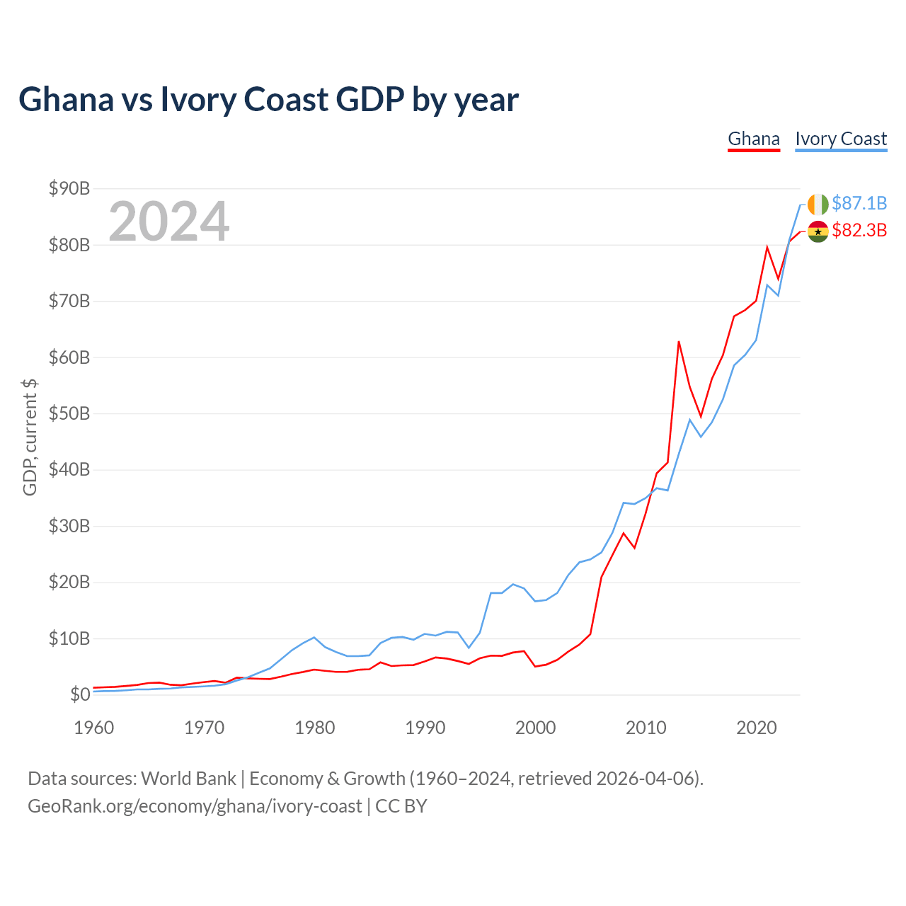 Ghana has a GDP of $82.3B compared to $87.1B for Ivory Coast, ranking 80/197 and 77/197 by economy size, respectively.