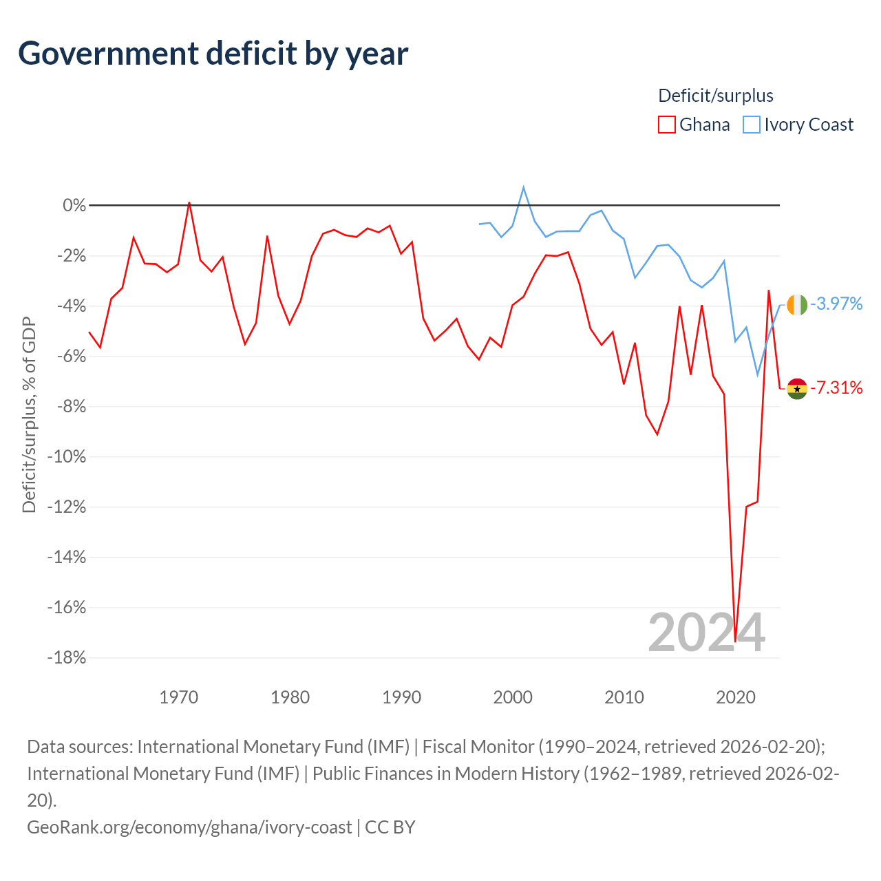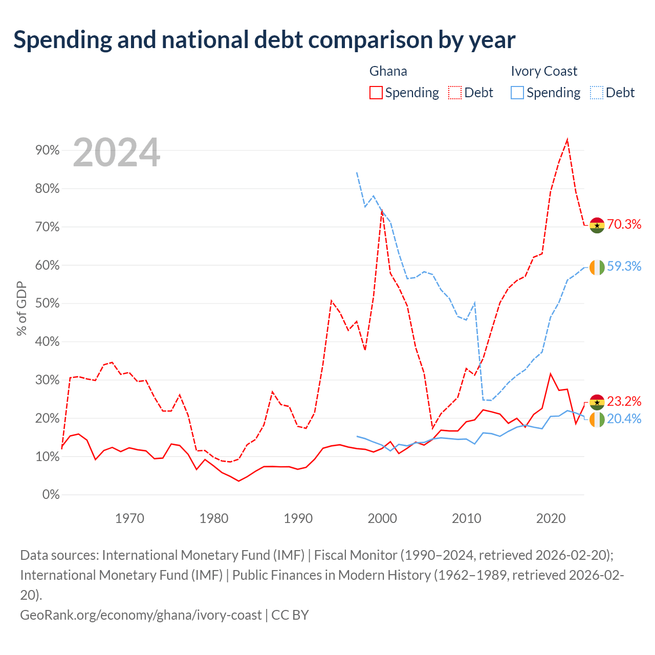 Ghana has $57.9B in government debt (70.3% of GDP), compared to $51.6B (59.3% of GDP) in Ivory Coast.