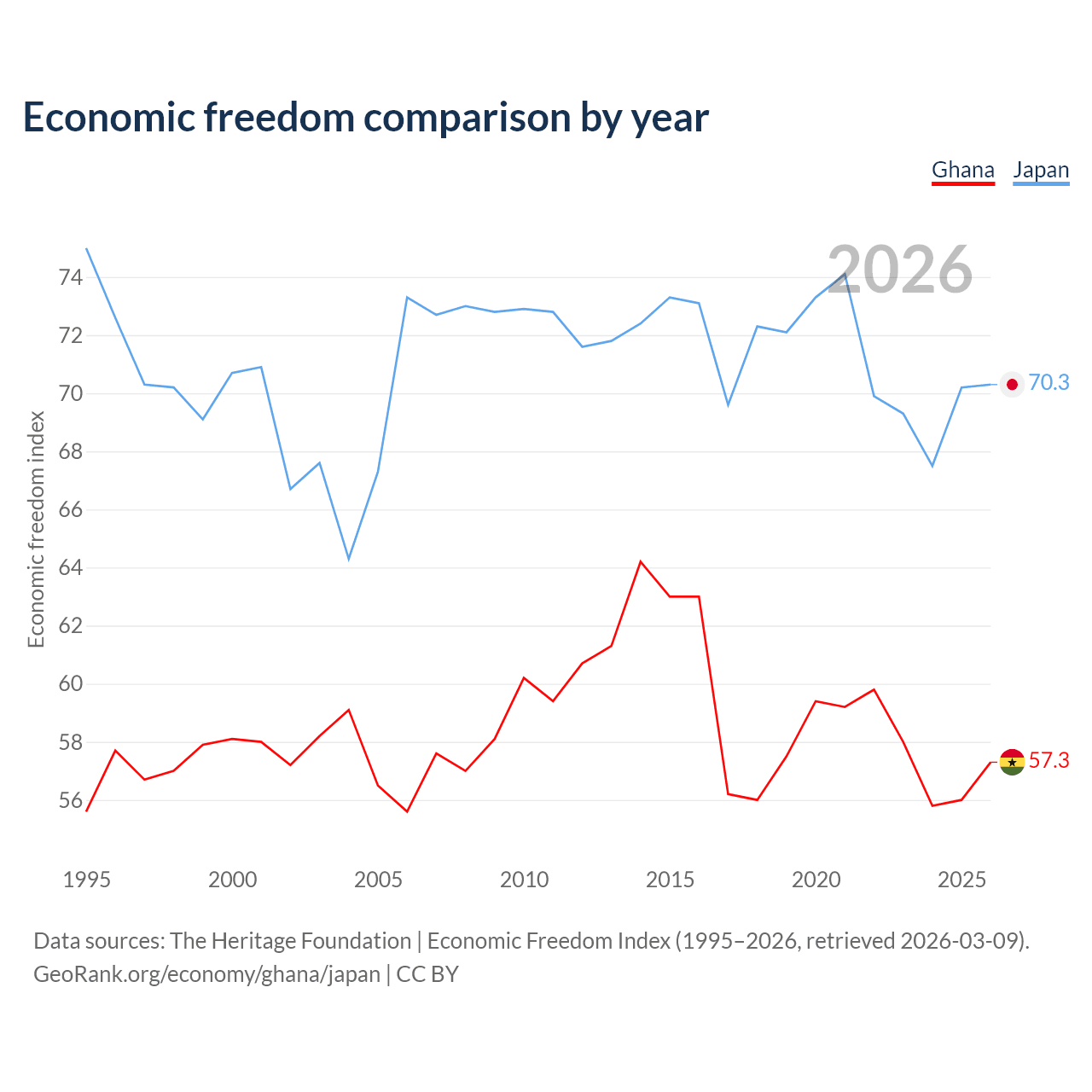 The Economic Freedom Index for Ghana is 57.3, ranking 118/197, compared to 70.3 for Japan, ranking 36/197. The chart above displays a comparison of annual changes in economic freedom indexes.
