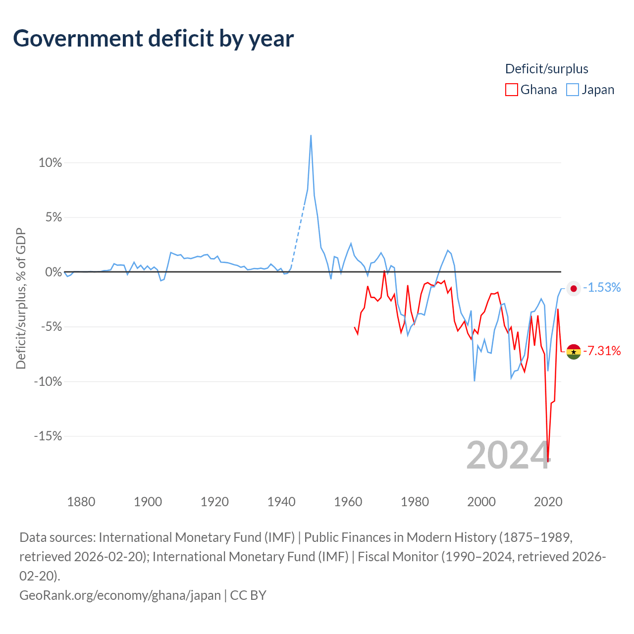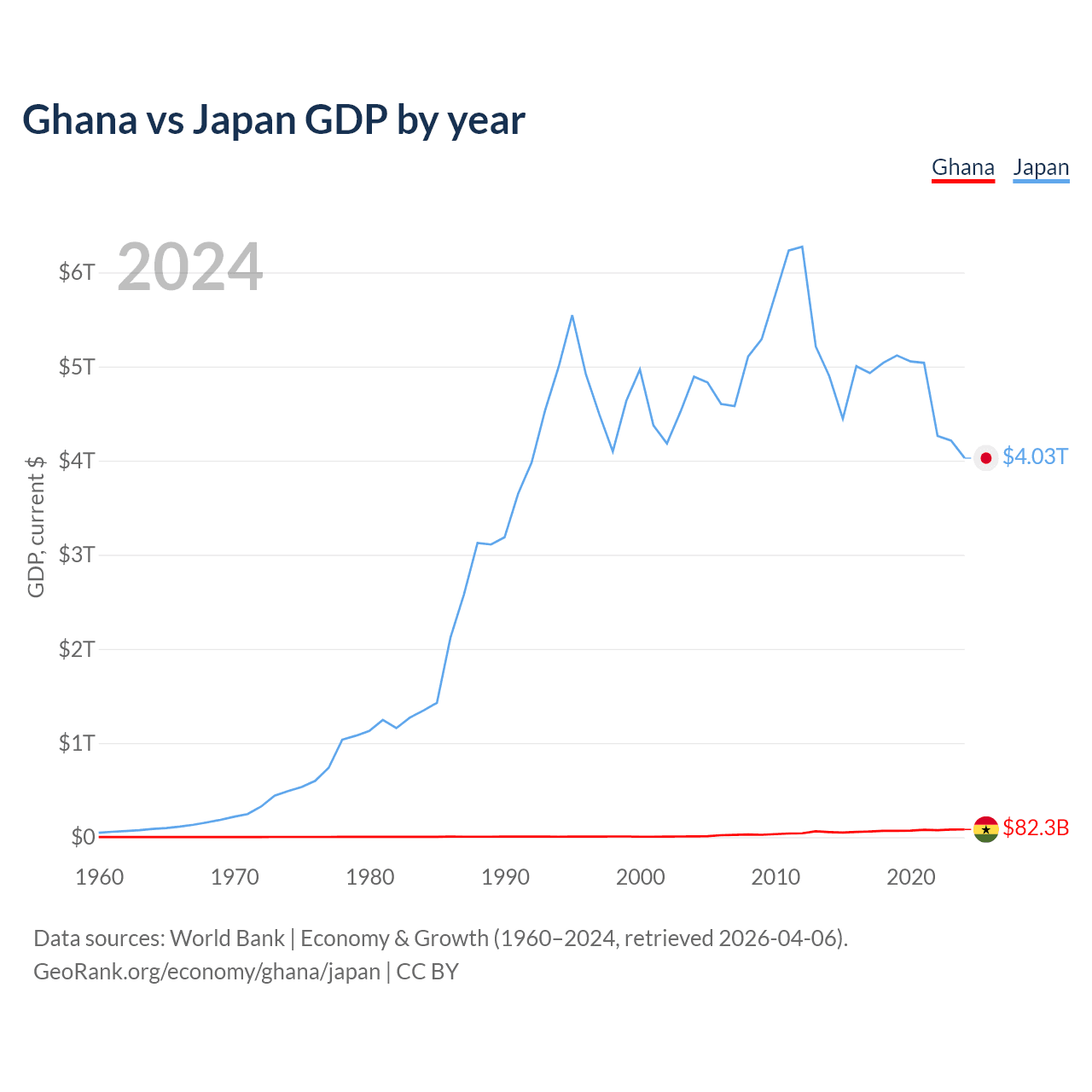 Ghana has a GDP of $82.3B compared to $4.03T for Japan, ranking 80/197 and 4/197 by economy size, respectively.