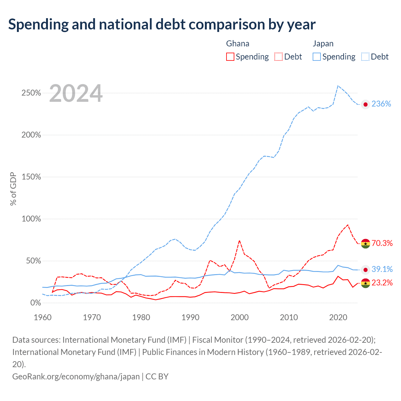 Ghana has $57.9B in government debt (70.3% of GDP), compared to $9.51T (236.1% of GDP) in Japan.