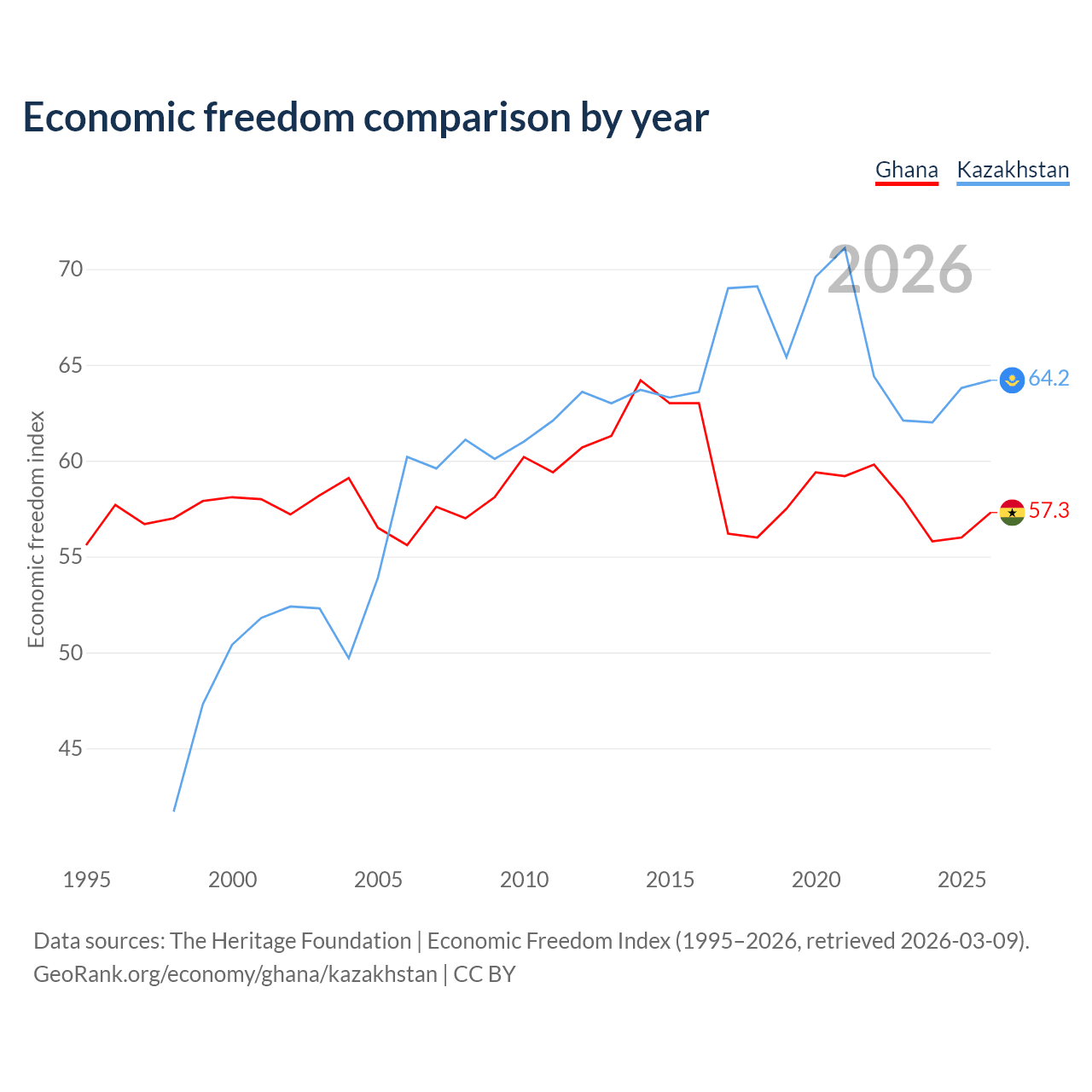 The Economic Freedom Index for Ghana is 57.3, ranking 118/197, compared to 64.2 for Kazakhstan, ranking 75/197. The chart above displays a comparison of annual changes in economic freedom indexes.