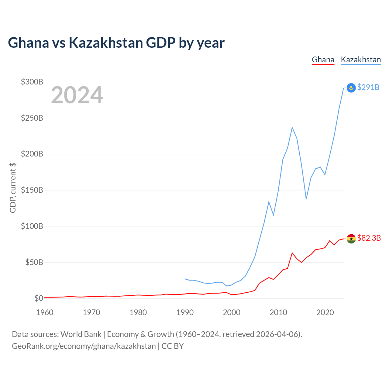Ghana has a GDP of $82.3B compared to $291B for Kazakhstan, ranking 80/197 and 48/197 by economy size, respectively.