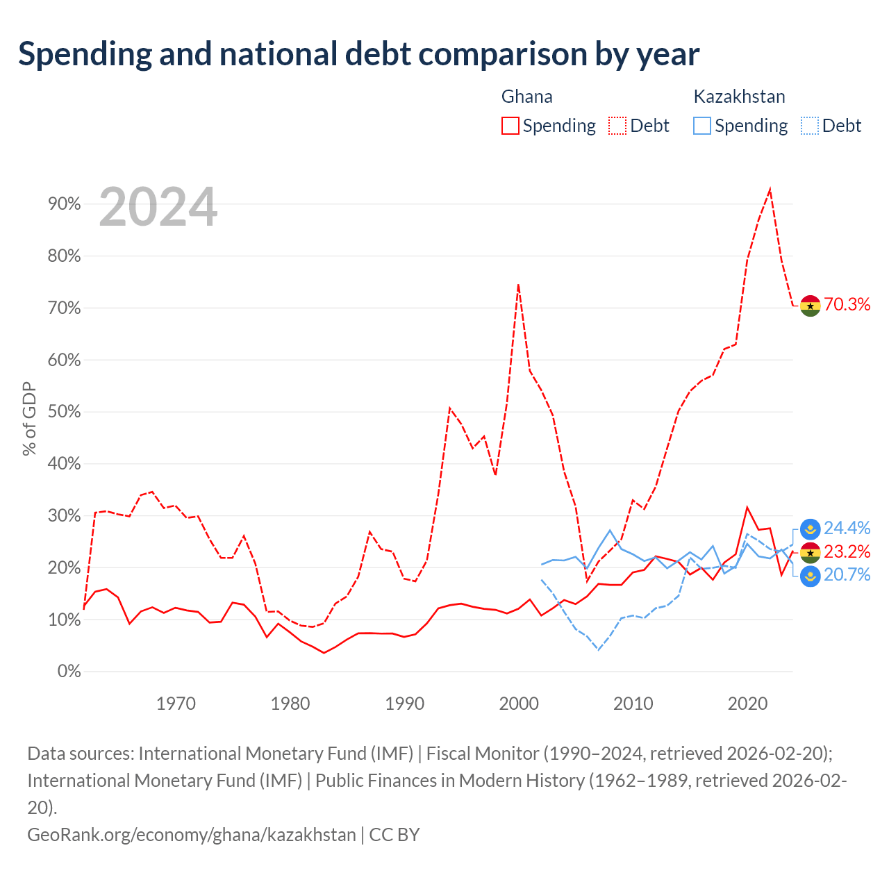 Ghana has $57.9B in government debt (70.3% of GDP), compared to $71.1B (24.4% of GDP) in Kazakhstan.