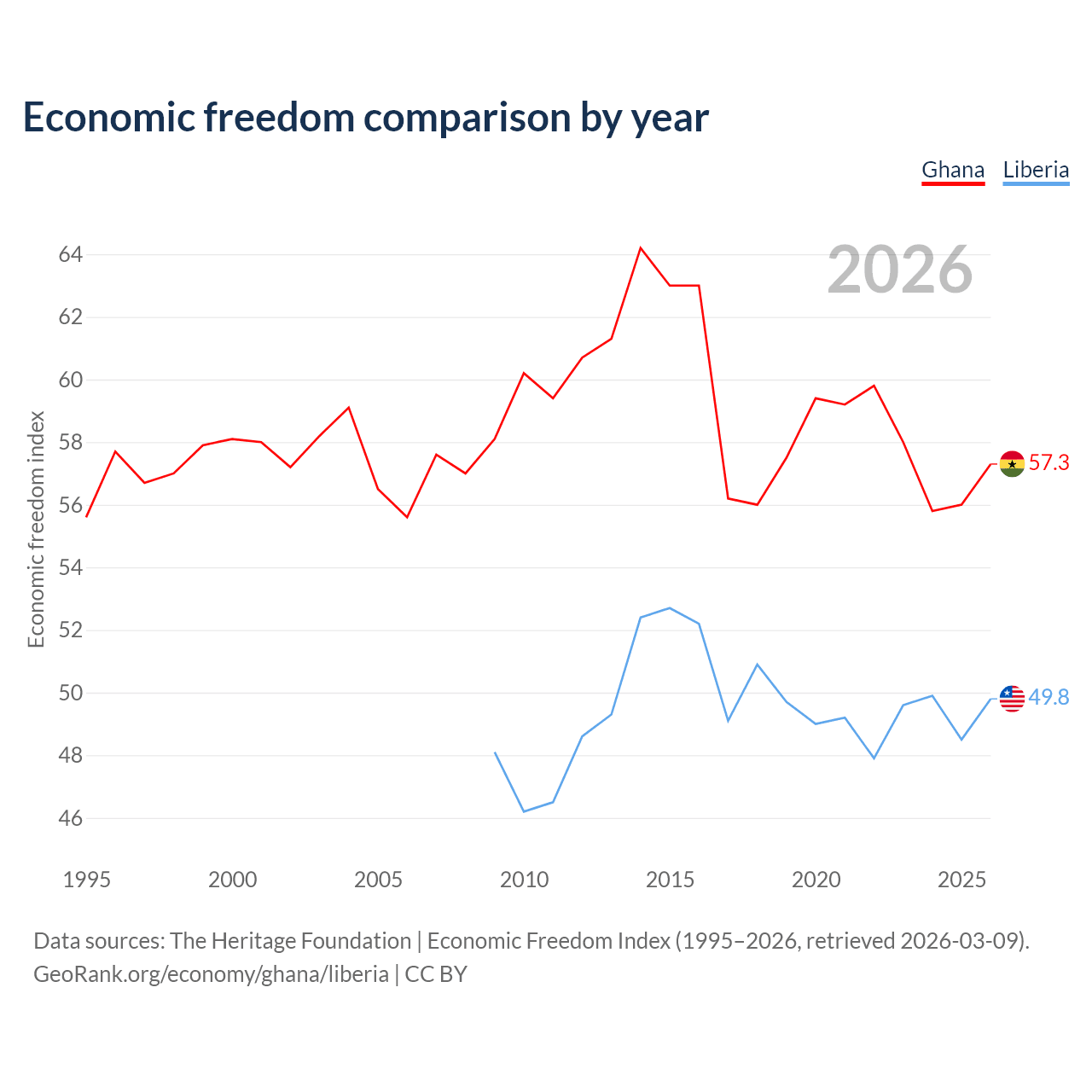 The Economic Freedom Index for Ghana is 57.3, ranking 118/197, compared to 49.8 for Liberia, ranking 163/197. The chart above displays a comparison of annual changes in economic freedom indexes.
