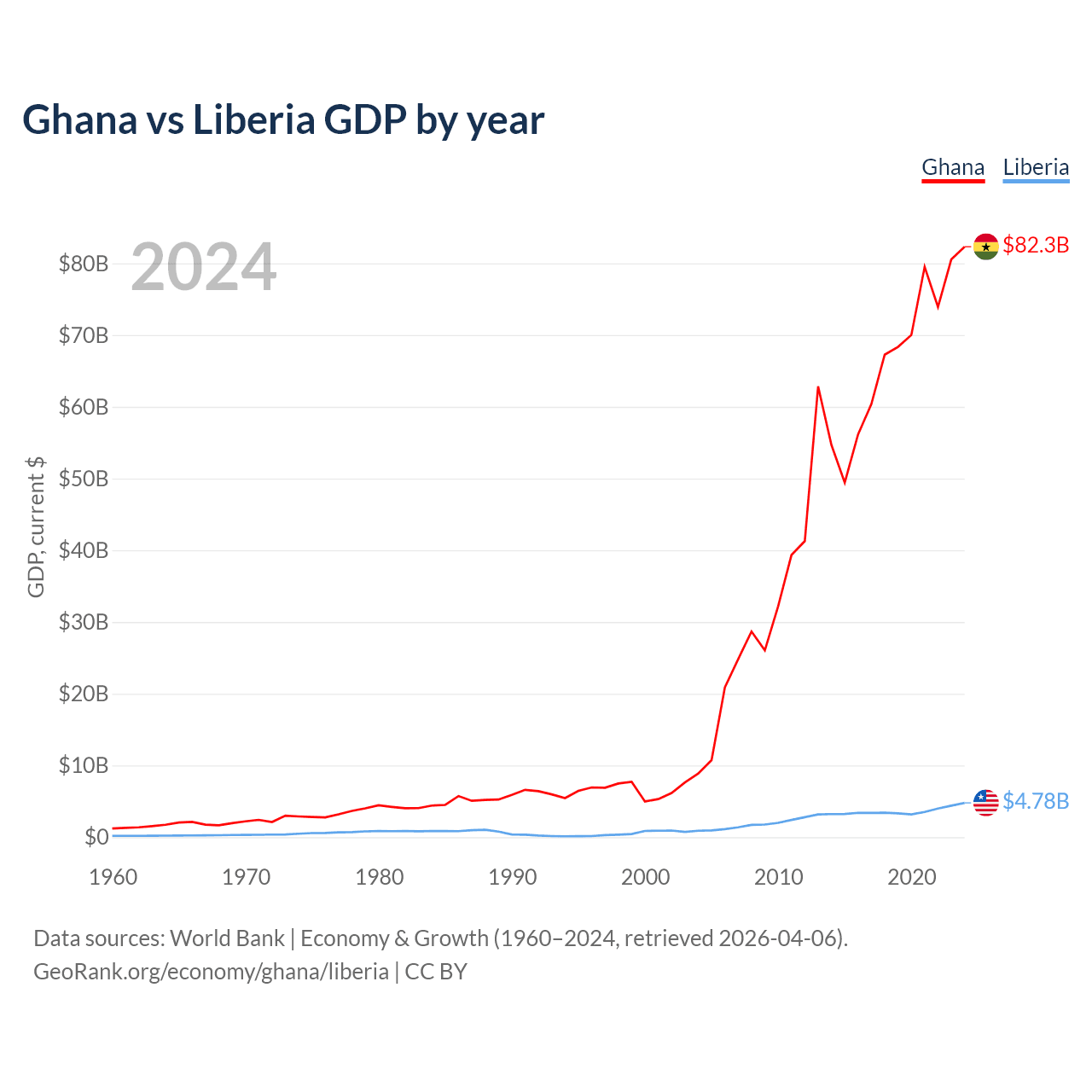 Ghana has a GDP of $82.3B compared to $4.78B for Liberia, ranking 80/197 and 163/197 by economy size, respectively.