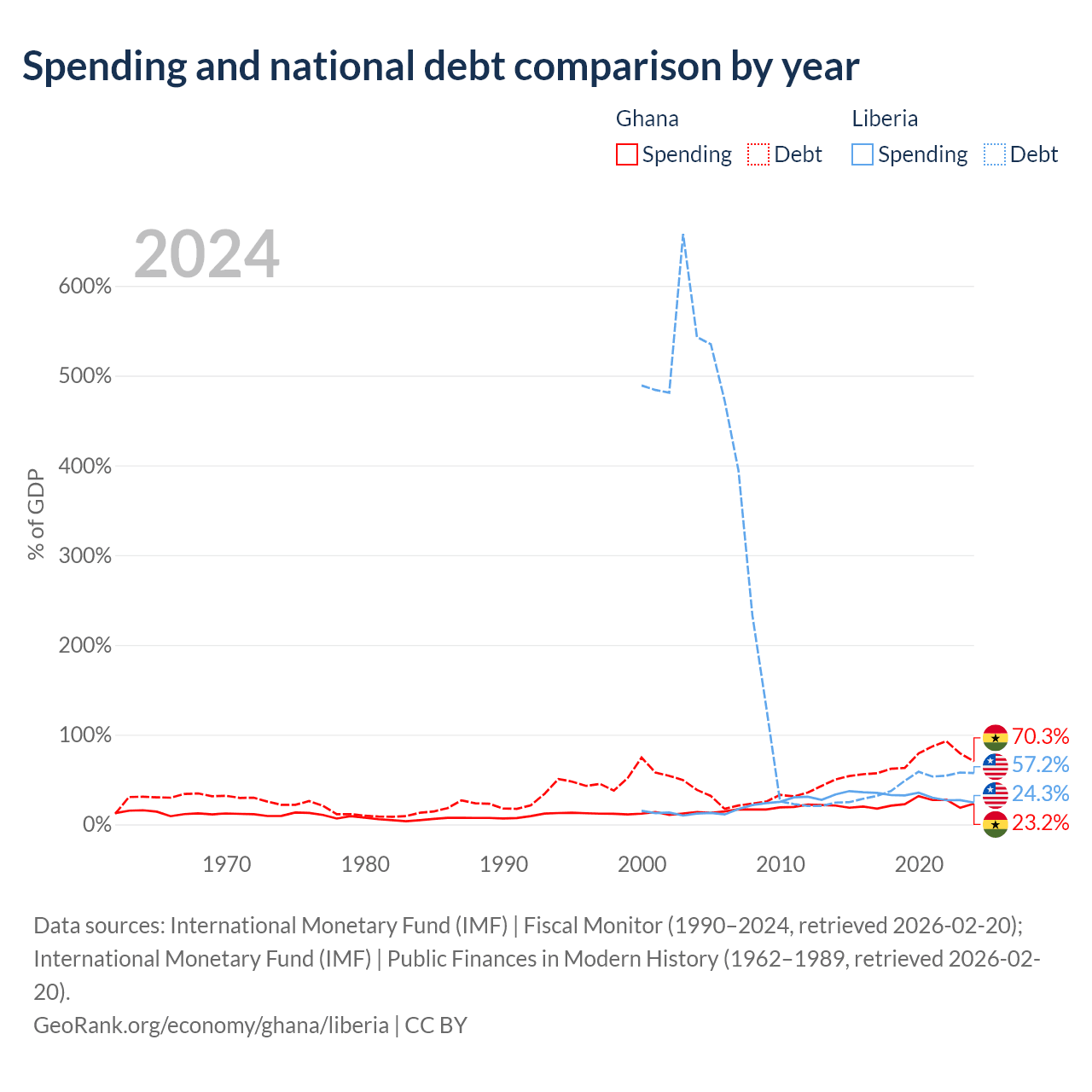 Ghana has $57.9B in government debt (70.3% of GDP), compared to $2.73B (57.2% of GDP) in Liberia.