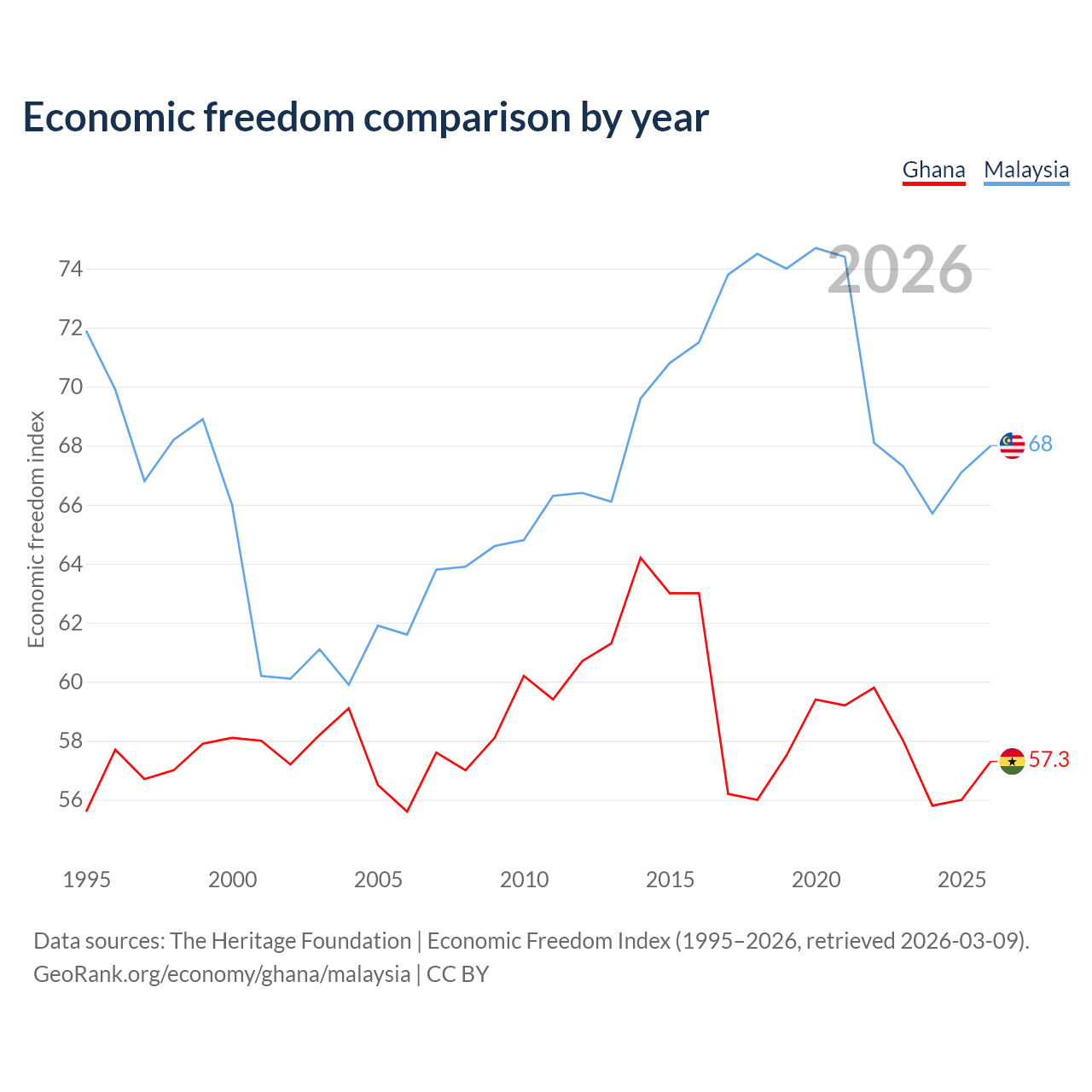 The Economic Freedom Index for Ghana is 57.3, ranking 118/197, compared to 68 for Malaysia, ranking 51/197. The chart above displays a comparison of annual changes in economic freedom indexes.