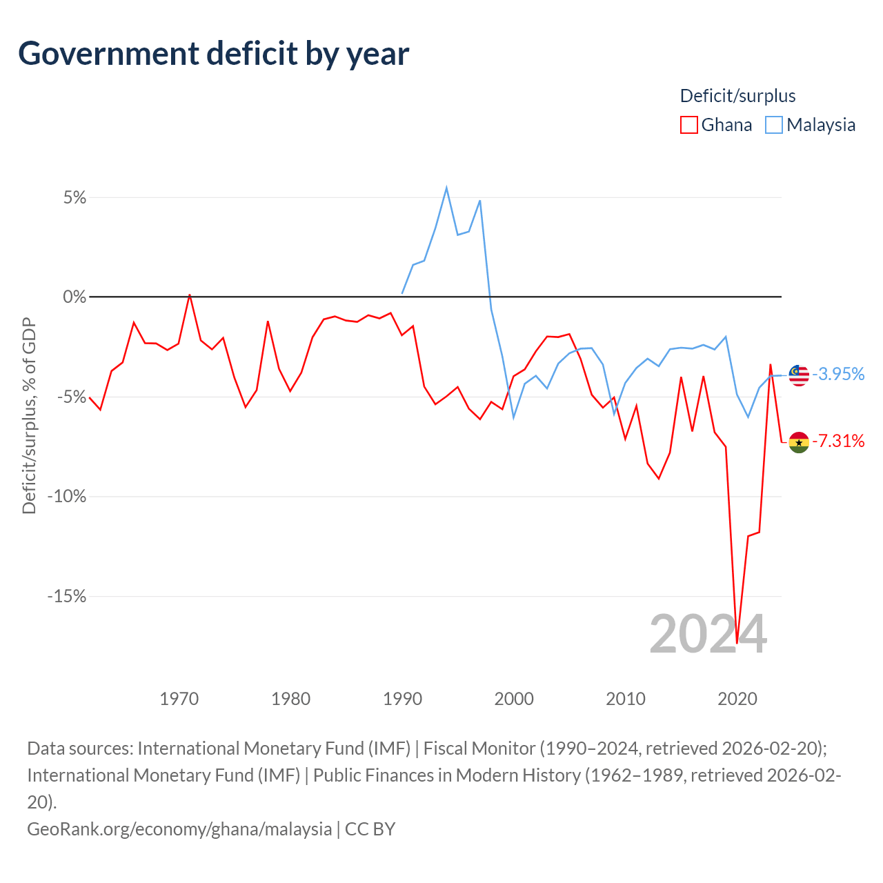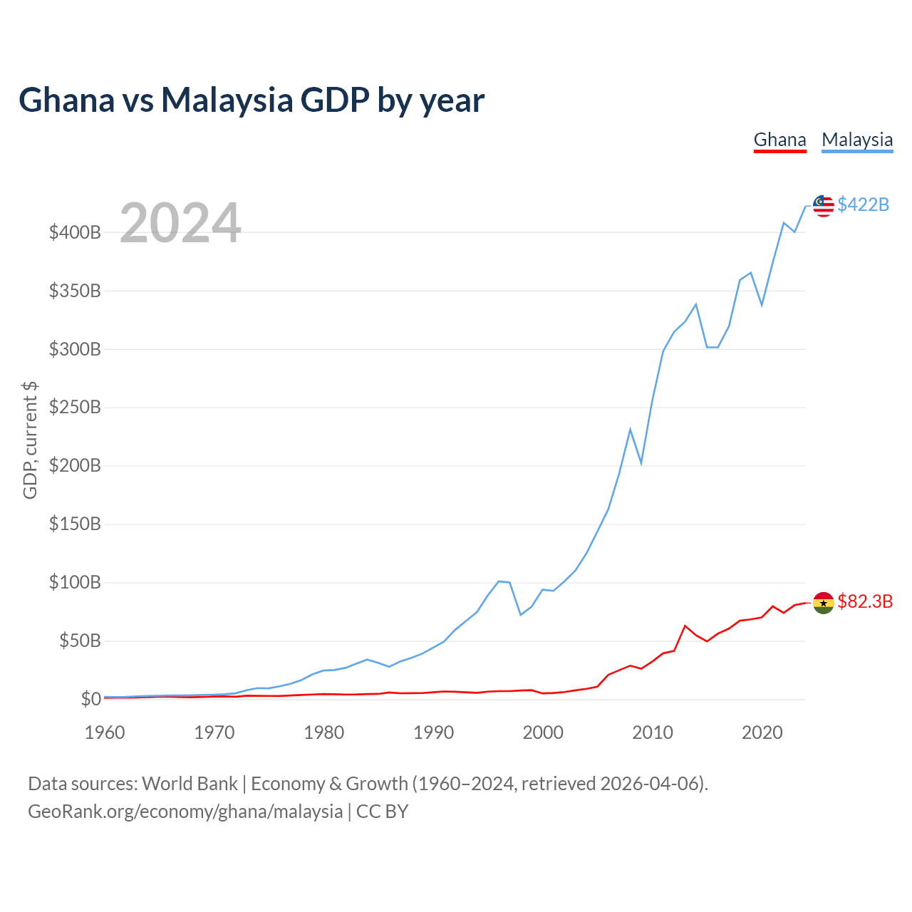 Ghana has a GDP of $82.3B compared to $422B for Malaysia, ranking 80/197 and 38/197 by economy size, respectively.