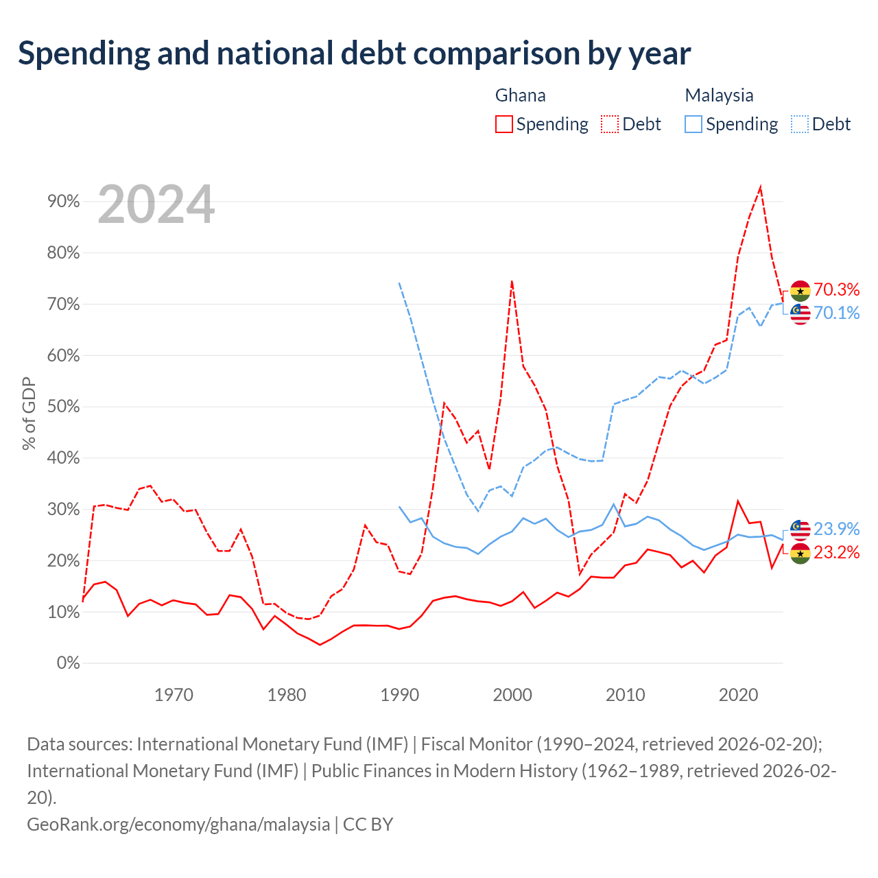 Ghana has $57.9B in government debt (70.3% of GDP), compared to $296B (70.1% of GDP) in Malaysia.