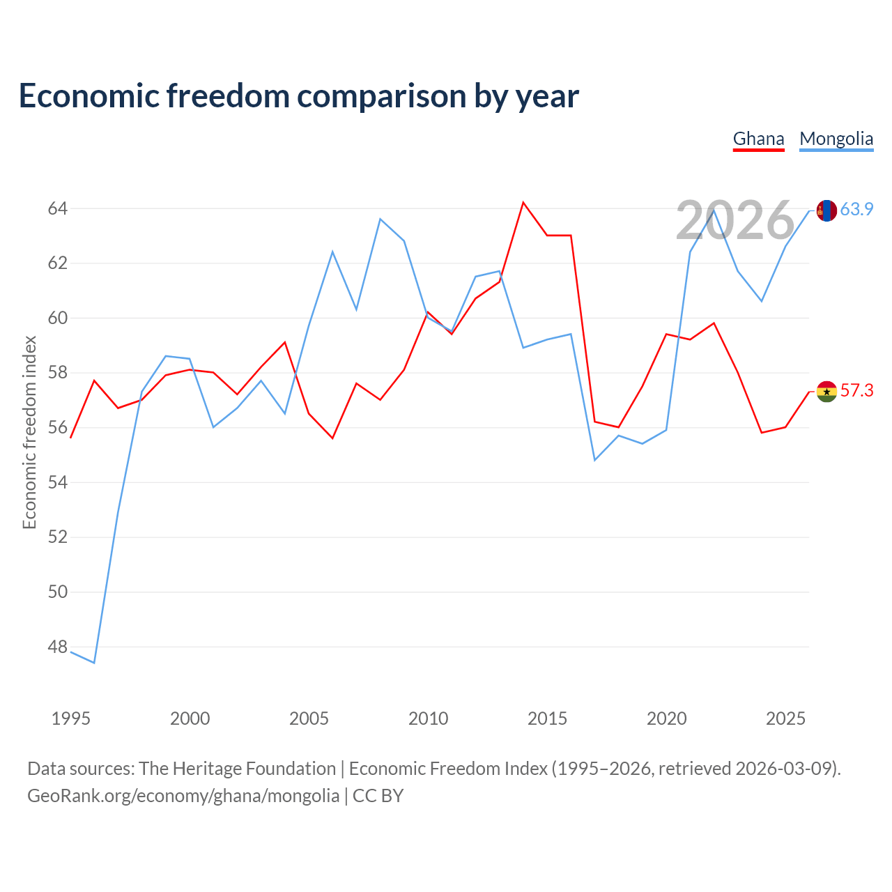 The Economic Freedom Index for Ghana is 57.3, ranking 118/197, compared to 63.9 for Mongolia, ranking 76/197. The chart above displays a comparison of annual changes in economic freedom indexes.