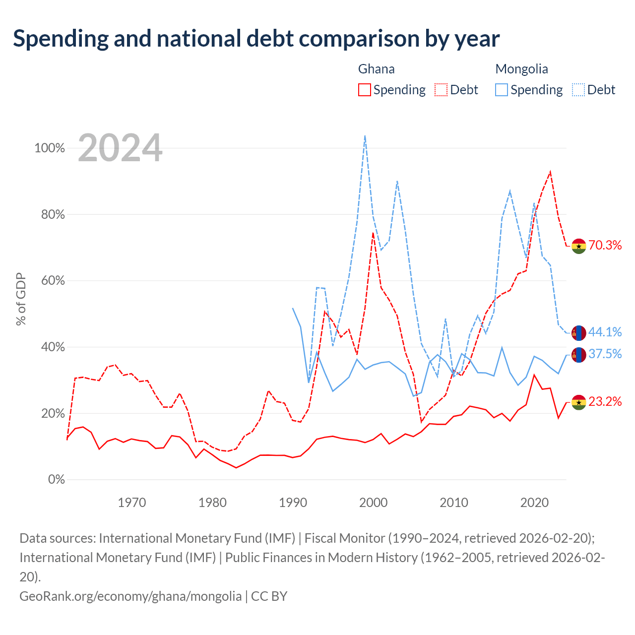Ghana has $57.9B in government debt (70.3% of GDP), compared to $10.5B (44.1% of GDP) in Mongolia.