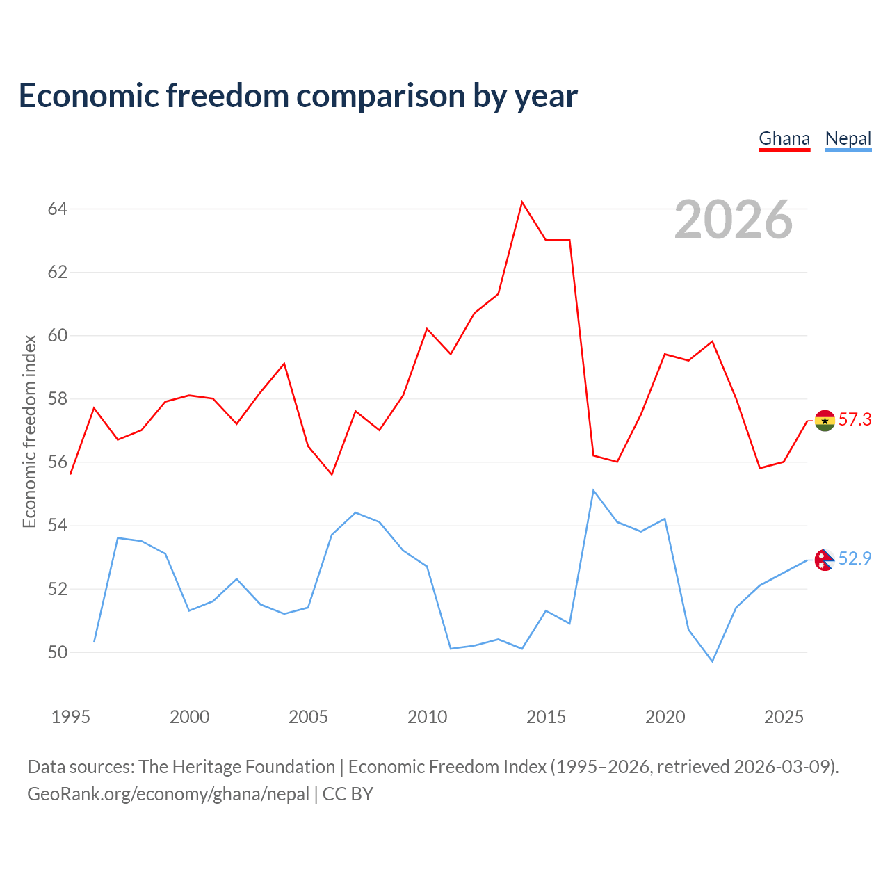 The Economic Freedom Index for Ghana is 57.3, ranking 118/197, compared to 52.9 for Nepal, ranking 144/197. The chart above displays a comparison of annual changes in economic freedom indexes.