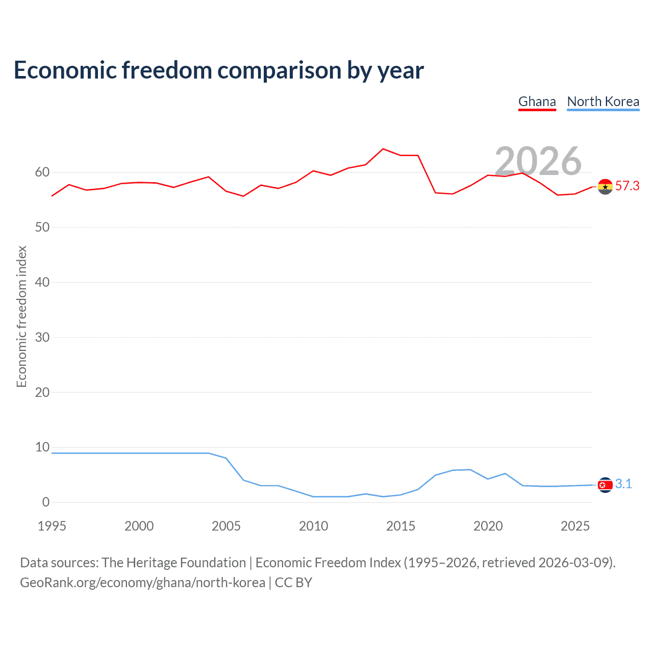 The Economic Freedom Index for Ghana is 57.3, ranking 118/197, compared to 3.1 for North Korea, ranking 197/197. The chart above displays a comparison of annual changes in economic freedom indexes.