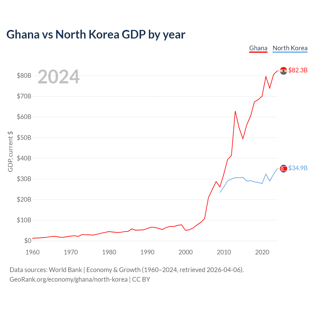 Ghana has a GDP of $82.3B compared to $34.9B for North Korea, ranking 80/197 and 106/197 by economy size, respectively.